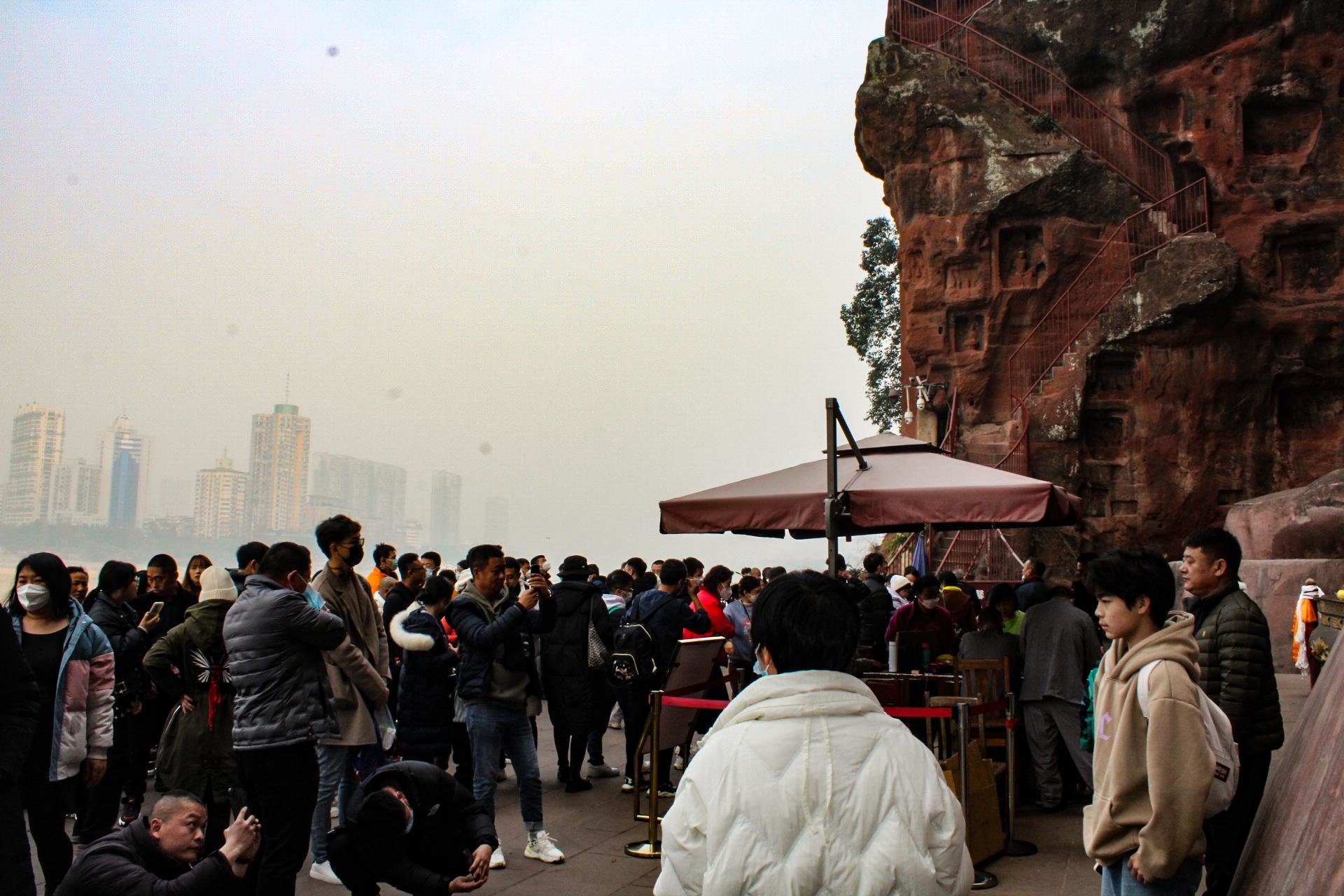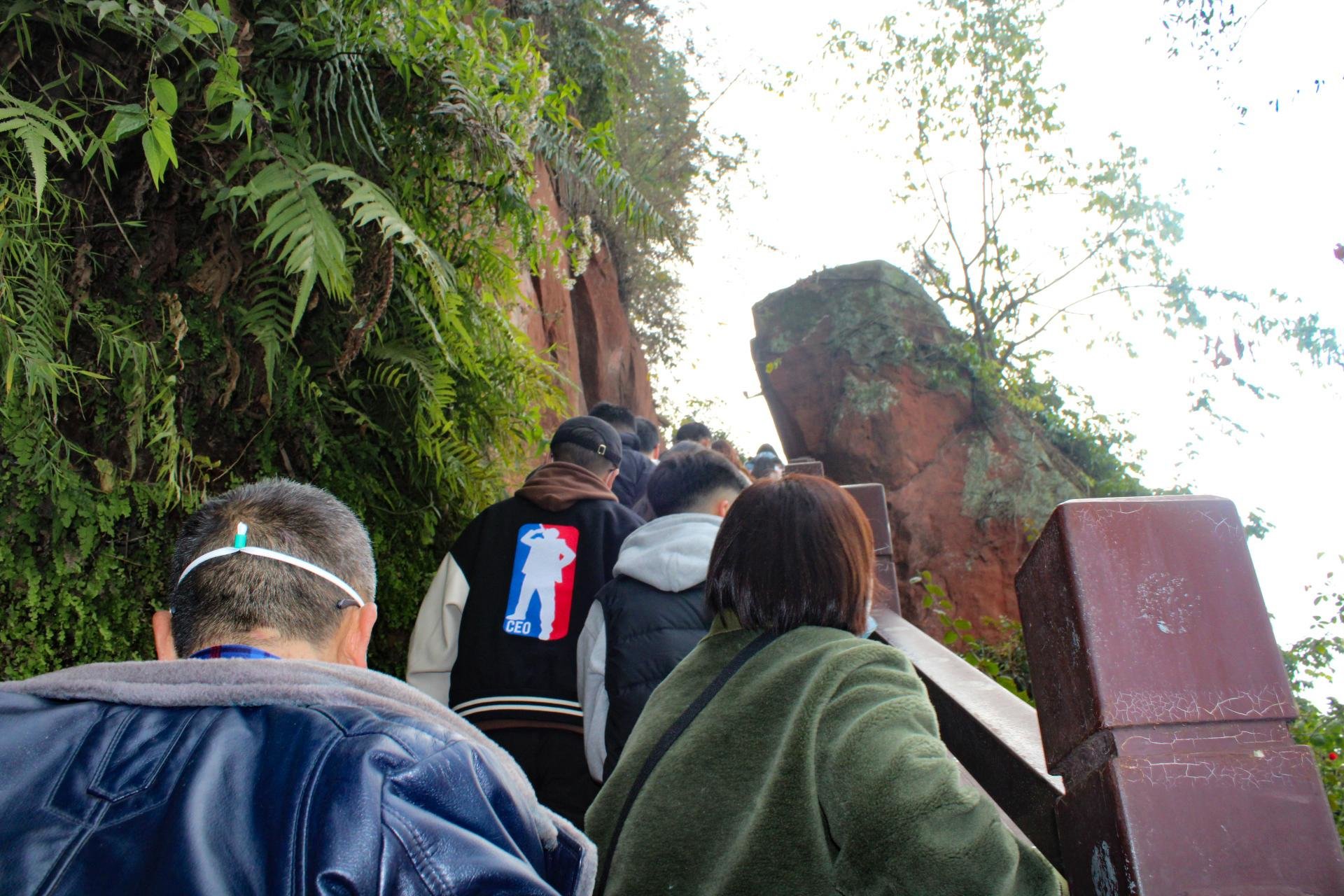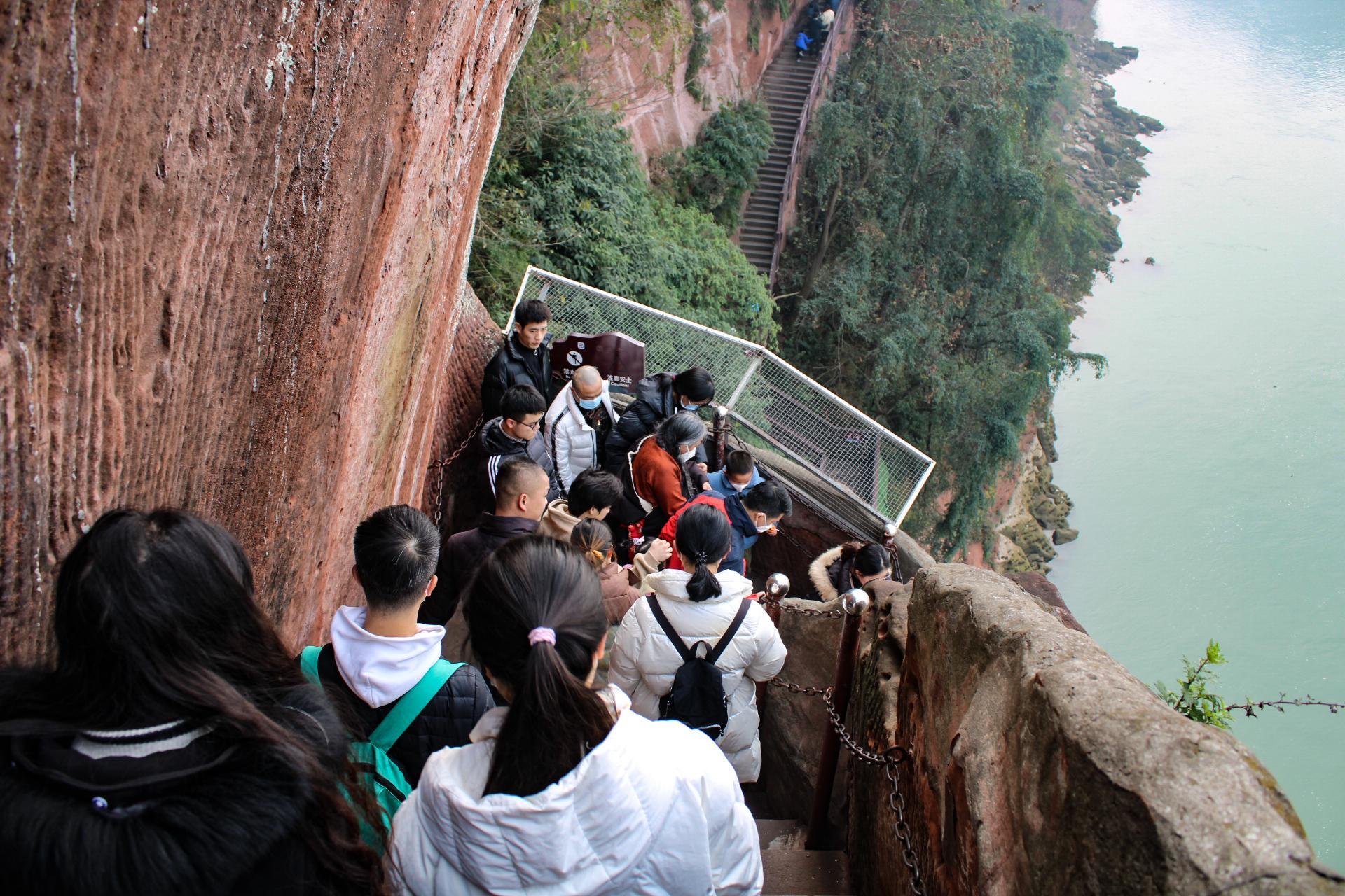 通往大佛脚底的通道很狭窄陡峭,人与人之间保持一米距离很难,不过这个时候出来旅游的大多数是“阳康”。
