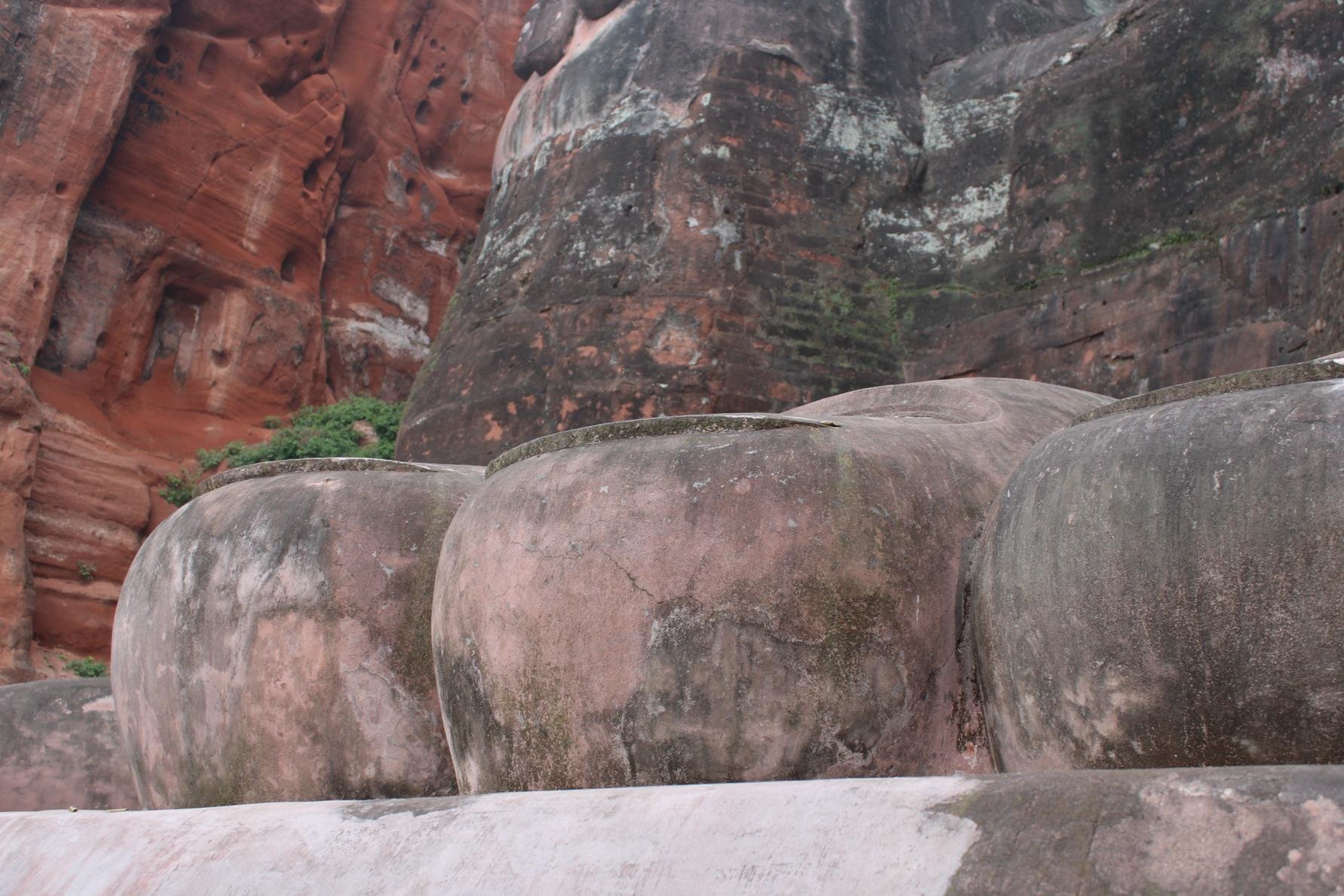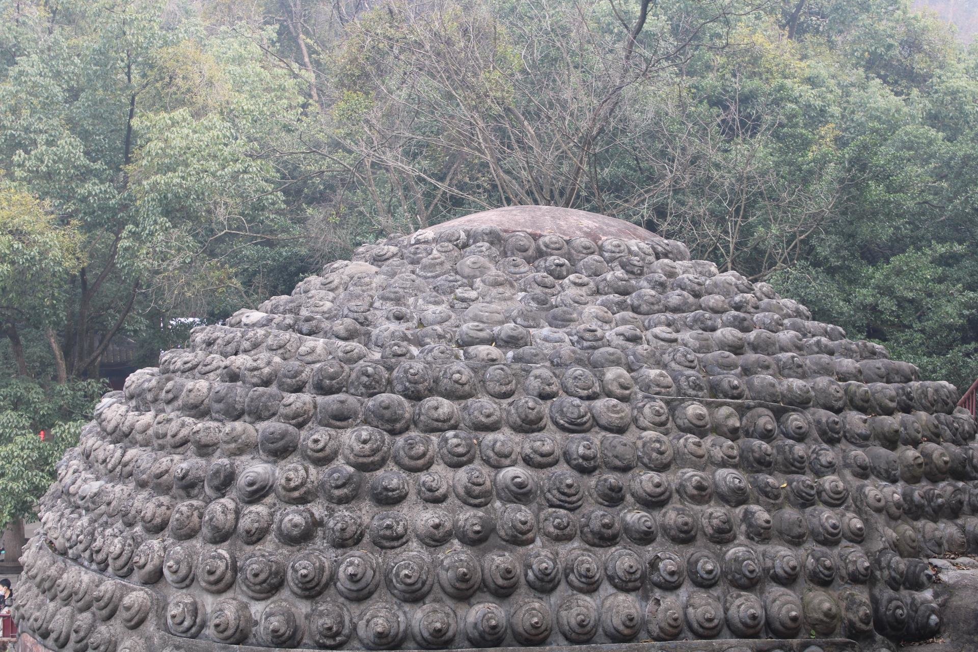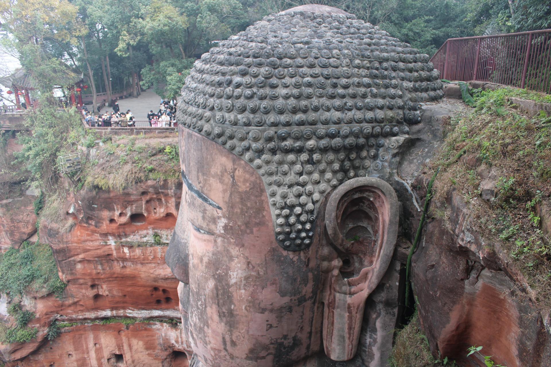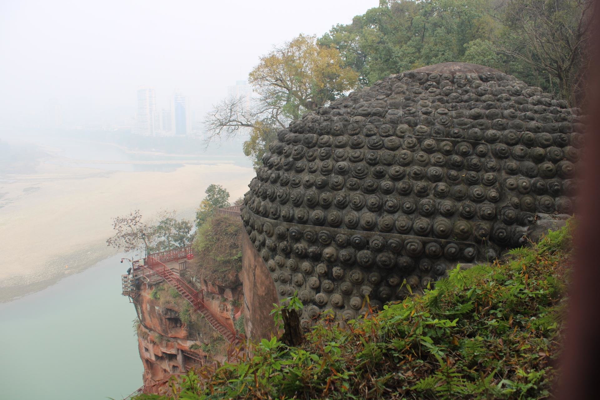 据元哥介绍,大佛佛髻是雕刻好之后再放上去的,能够起到排水的作用,这也是大佛千年不朽的工程秘密之一。佛髻者,呈盘曲状发髻的美称。相传佛发旋曲为螺形,故称。李商隐 《镜槛》诗云:“仙眉琼作叶,佛髻钿为螺。”