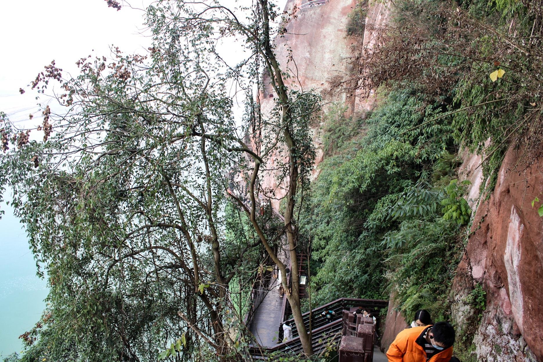 四川乐山大佛右侧的石壁上,有一条险峻的栈道自上而下盘旋至大佛脚,这便是著名的“九曲栈道”,是与修建佛像同时开凿的。