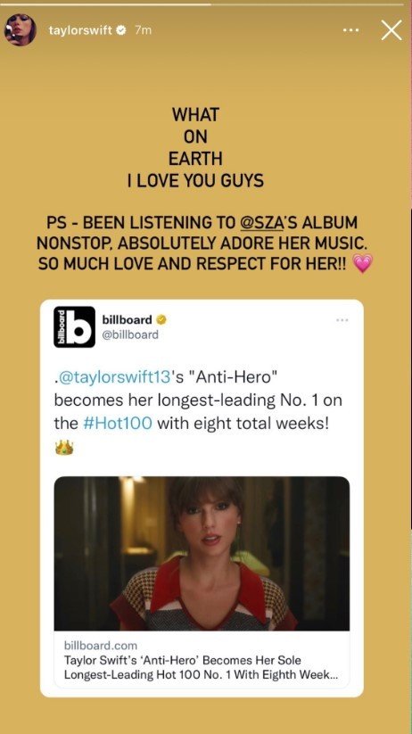 Taylor Swift在Ins故事中分享了《Anti-Hero》拿下Billboard单曲榜八周冠,刷新个人夺冠周数纪录的新闻,表达了对大家的感谢。Taylor还表达了对SZA新专辑《S.O.S》的喜爱,表示自己非常喜欢SZA的音乐,对她只有爱和尊重。