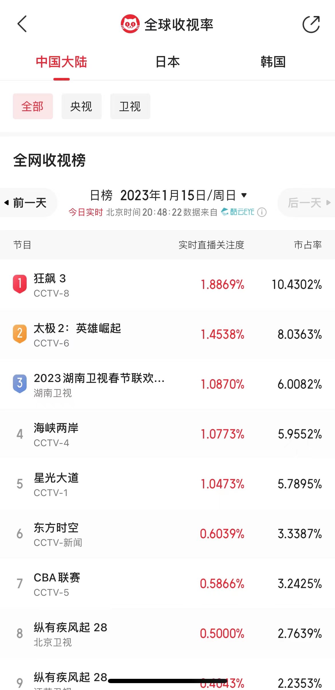这个收视冠军,可不仅仅只是在地方卫视比较中成为冠军,而是包含了央视各个频道的收视率。辽视春晚在晚间9点半左右的直播收视率达到了2.6%,此时收视率排在第二名的是央视一套播出的电视剧《破晓东方》,收视率是1.3%。紧随其后的,还有央视六套、央视八套、央视四套和央视三套,湖南卫视则排在第7位。能够看出辽视春晚的收视率,以绝对优势成为冠军。前几天湖南卫视的小年夜春晚,因为有太多的明星参与,最终收视率和话题度都获得了喜人的成绩。可是当时湖南卫视的小年夜春晚的收视率,也仅仅排在第三位,落后于央视的两个频道,收视率只是在1%左右。
