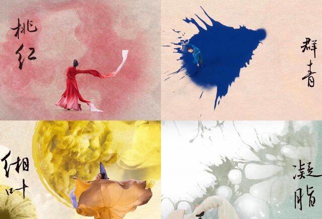 整个舞台就叫《满庭芳·国色》,除了赵丽颖和唐诗逸,每一位舞者出场都代表了一款中国传统颜色。舞美设计十分高级,舞者和色彩的搭配也恰到好处。