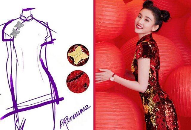 用最经典的中式立领设计,配合立体灯笼袖的造型,再加上明红色系兰花纹,满眼都是中国年的喜气洋洋。裙子是M Essential为她专属定制的。
