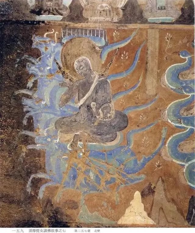 须摩提女故事主要见于三部佛经,即吴天竺沙门竺律炎译《佛说三摩竭经》;吴支谦译《须摩提女经》;前秦昙摩难提译《增壹阿含经·须陀品第三十》。第257窟是北魏洞窟,虽然这时三个译本都已经译出,但竺律炎译本的情节和壁画对不上号,《增壹阿含经》故事情节相同,可是译者比支谦晚,只能是后者来自前者,因而我们认为这幅画是根据支谦译本绘制而成。此窟的九色鹿本生画也是根据支谦译的《九色鹿经》绘制的。