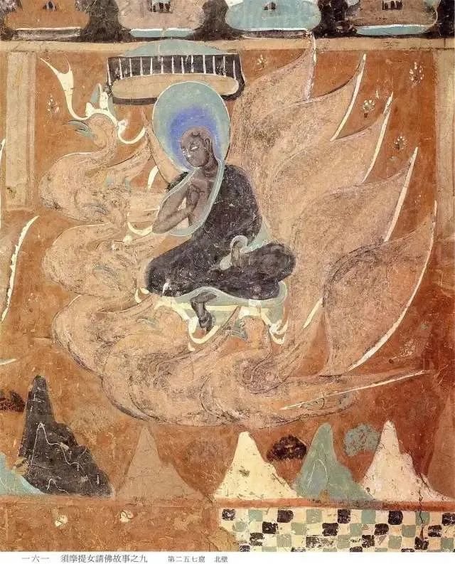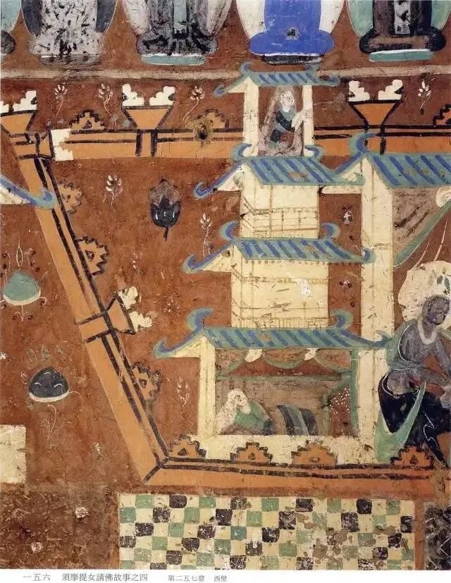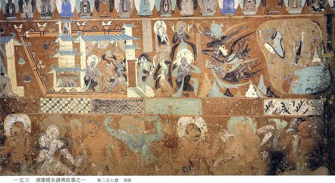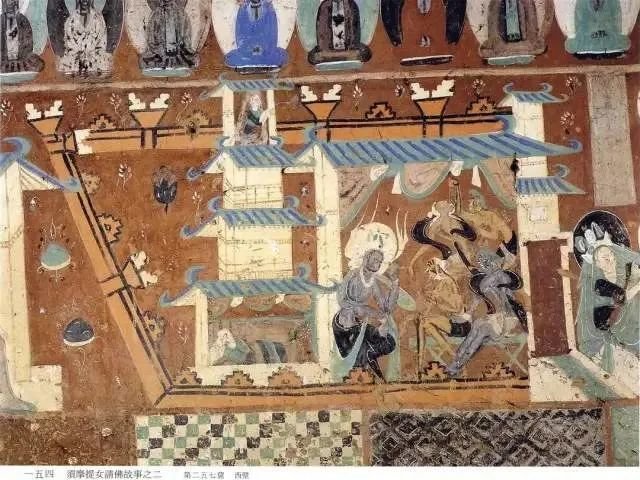 须摩提女故事属于因缘故事,敦煌石窟仅有一例,见于莫高窟北魏第257窟,此窟还画有著名的九色鹿故事(本生画)、沙弥守戒自杀故事(戒律画)等。