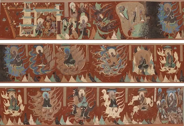 此图画面由14个情节组成:⑴须摩提女焚香请佛;⑵乾荼背负大釜而来;⑶沙弥均头变五百花树飞来;⑷般特乘五百青牛飞来;⑸罗云乘五百孔雀飞来;⑹迦匹那乘五百金翅鸟飞来;⑺优毗迦叶乘五百龙飞来;⑻须菩提乘五百琉璃山飞来;⑼大迦旃延乘五百白鸽飞来;⑽离越乘五百虎飞来;⑾阿那律乘五百狮子飞来;⑿大迦叶乘五百马飞来;⒀目连乘五百六齿白象飞来;⒁释迦在簇拥下出现。