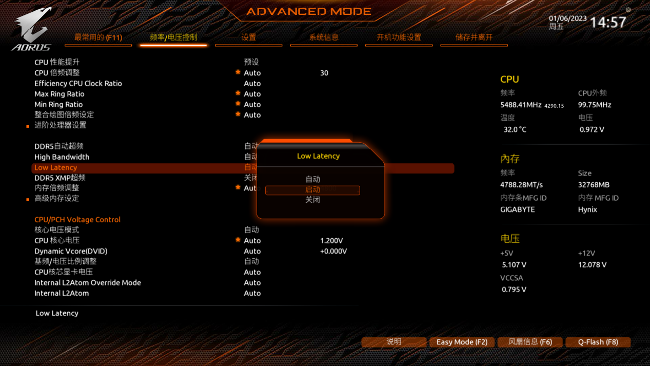 最独特的还要属 AORUS 系列主板独占的一个功能:还 DDR5 内存高带宽 & 低延迟模式 (High Bandwidth&Low Latency)。在开启后,主板会自动进行内存性能提升。根据技嘉实验室的数据,开启后读取可提升 2%、写入可提升 8%、复制可提升 4%、延迟可降低 12%。