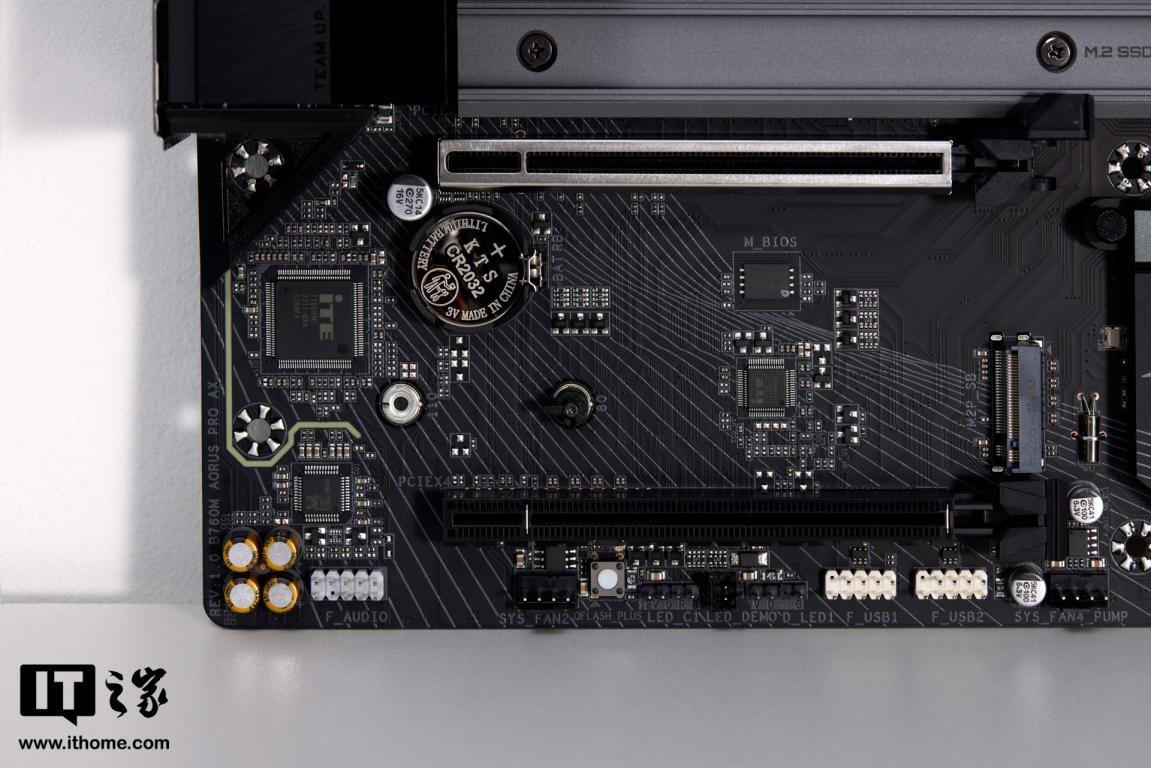 扩展方面,技嘉 B760 系列进一步强化了易用性。例如 M.2 从传统的螺丝固定升级到了旋钮快拆设计。PCI-E 显卡插槽也延续了 EZ-Latch 快易拆设计,即便是加大加厚的显卡,只要轻松推一下卡扣,就能免工具完成安装。