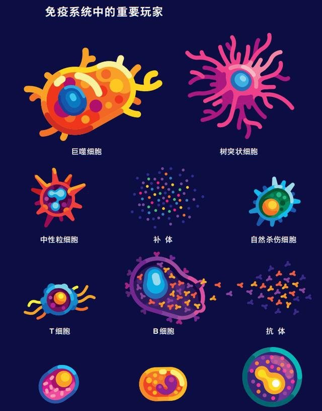 上面那些细胞的名字,可能很难记住,什么巨噬细胞、中性粒细胞、树突状细胞、B细胞、T细胞啊,其实没关系,你只需要明白,免疫系统是个优秀的团队,每种细胞都有不一样的功能,通过各种排列组合,互相打配合去完成复杂的治疗任务,增强我们的自愈能力就行了。