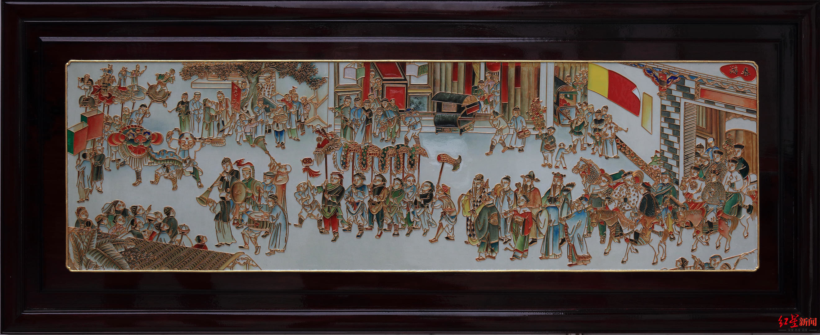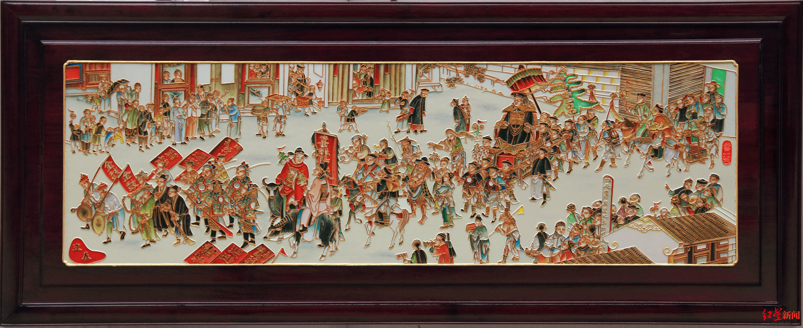 金丝年画《迎春图》共分为4段,包括迎春、报春、游春、打春,画中人物栩栩如生,其中,画作单段长116厘米、高35厘米。叶华介绍,在制作金丝年画《迎春图》长卷时,人物细节的手、头、眼都要精益求精,不能有丝毫的瑕疵。完成内容的制作后,他采用楠木和土漆对画作进行边框装裱。