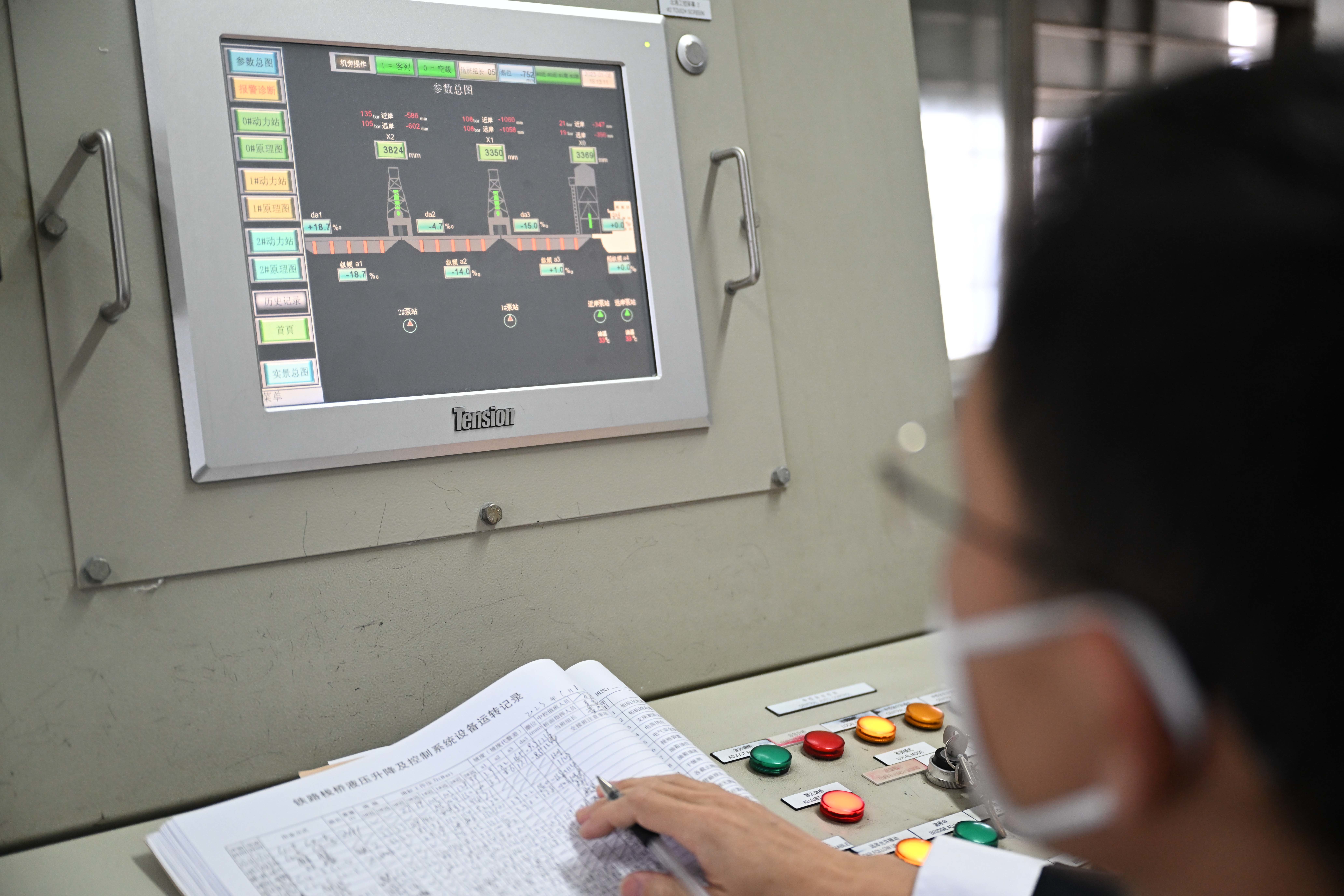 在广东徐闻的粤海铁路轮渡北港码头,熊美周在栈桥班组工作间记录设备数据(1月8日摄)。新华社记者 邓华 摄