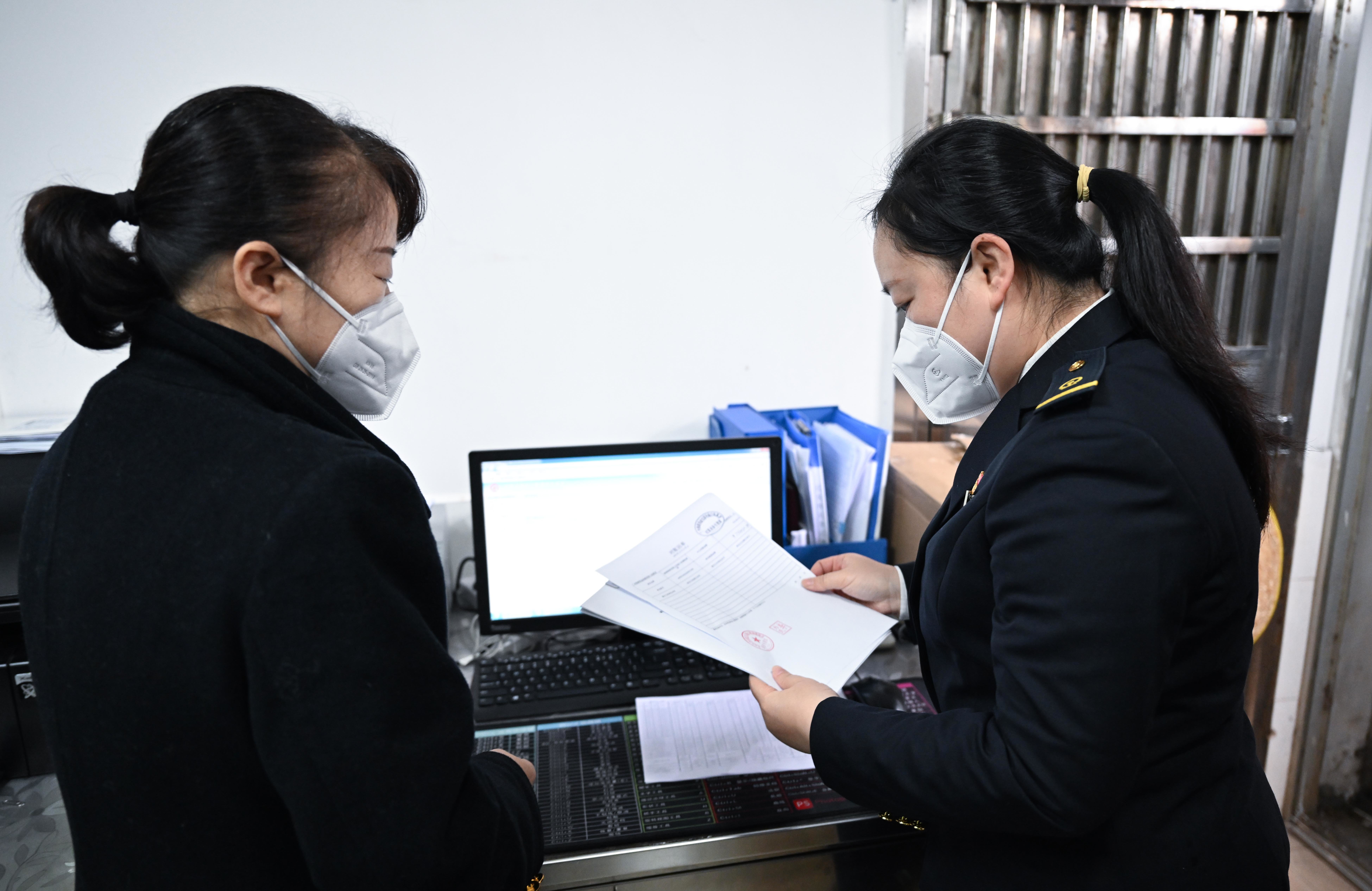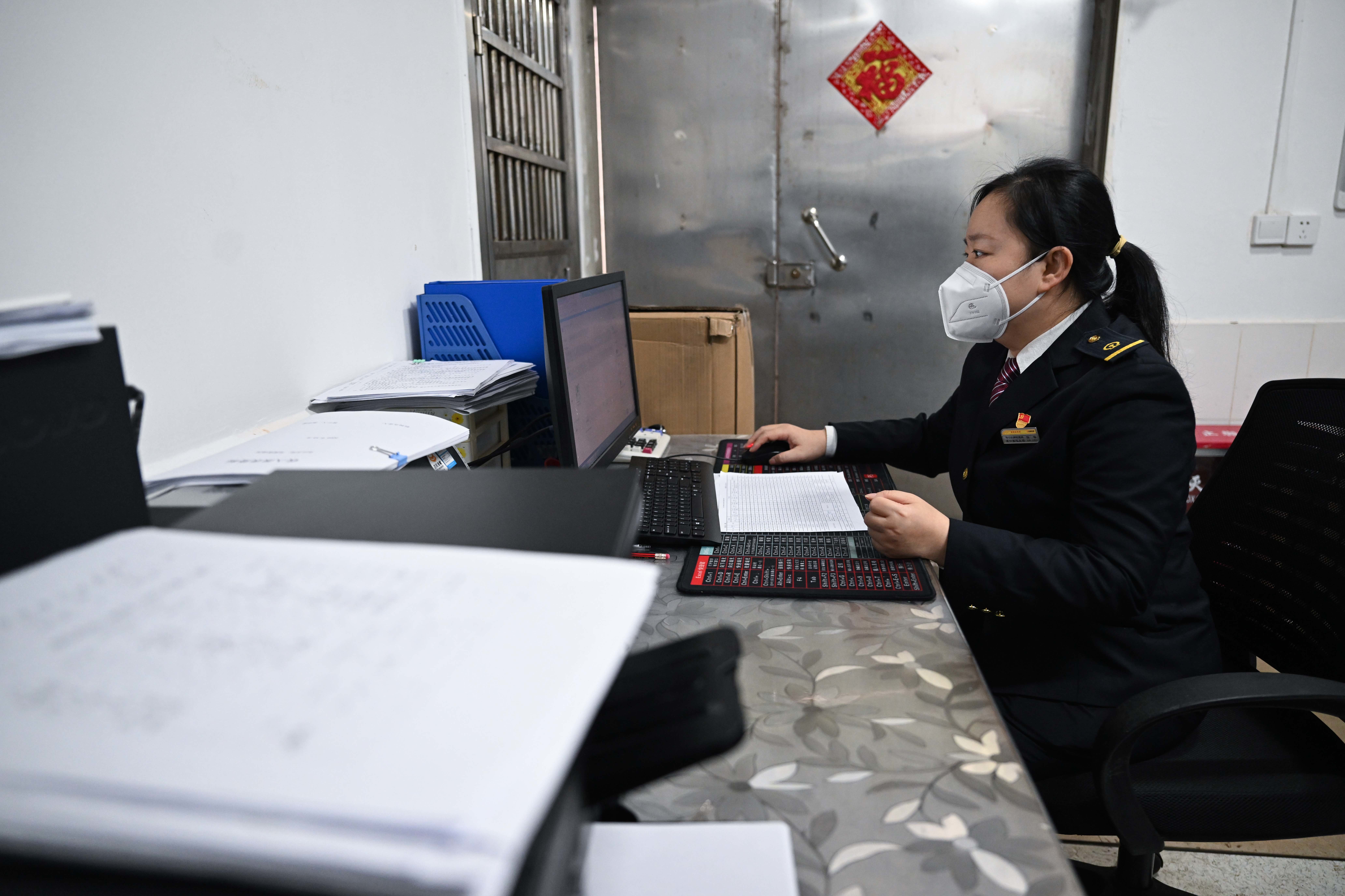在海口的粤海铁路轮渡南港码头售票处,伍琳处理当日工作(1月9日摄)。新华社记者 邓华 摄