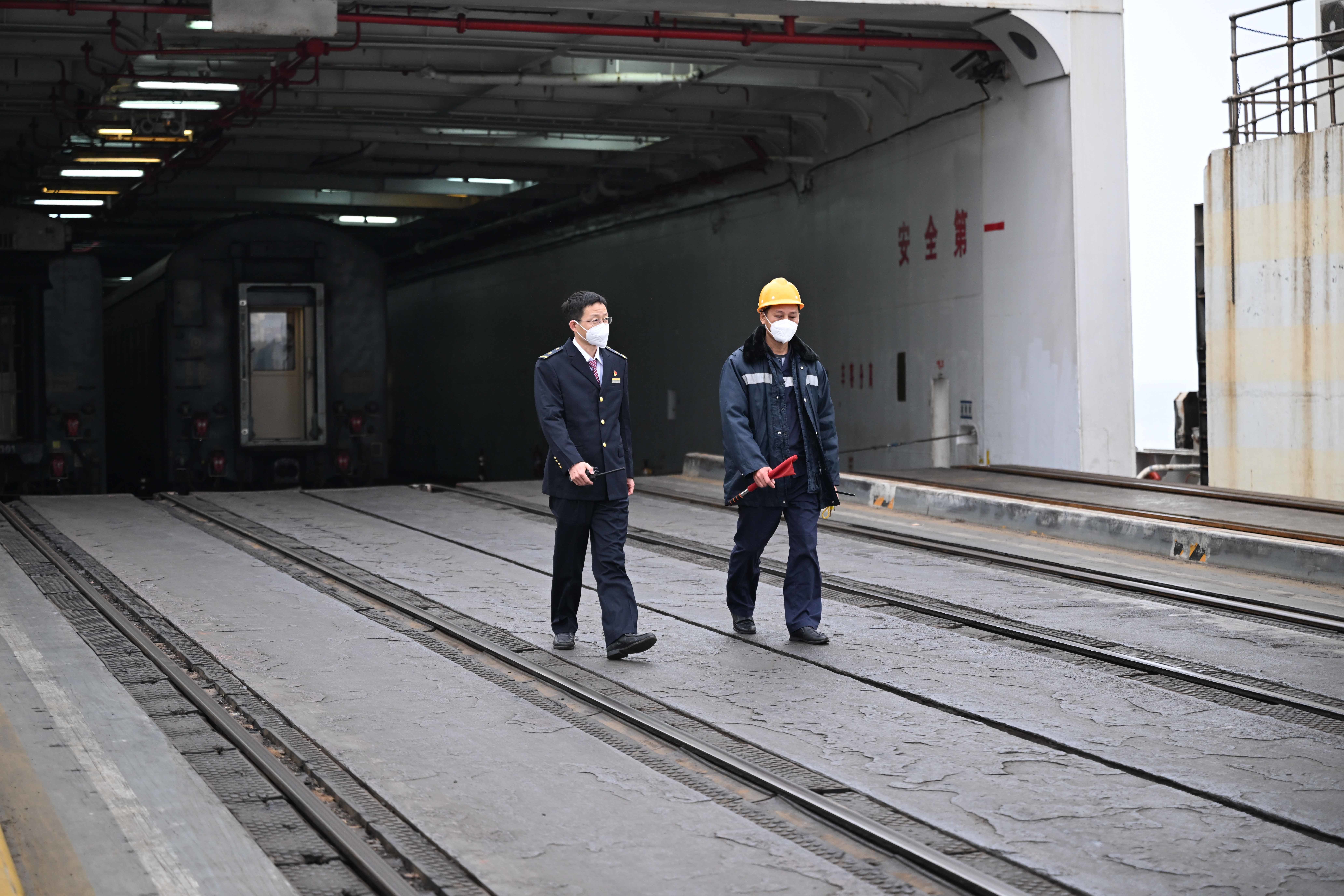 在广东徐闻的粤海铁路轮渡北港码头,熊美周(左)在火车栈桥上和同事一起工作(1月8日摄)。新华社记者 邓华 摄