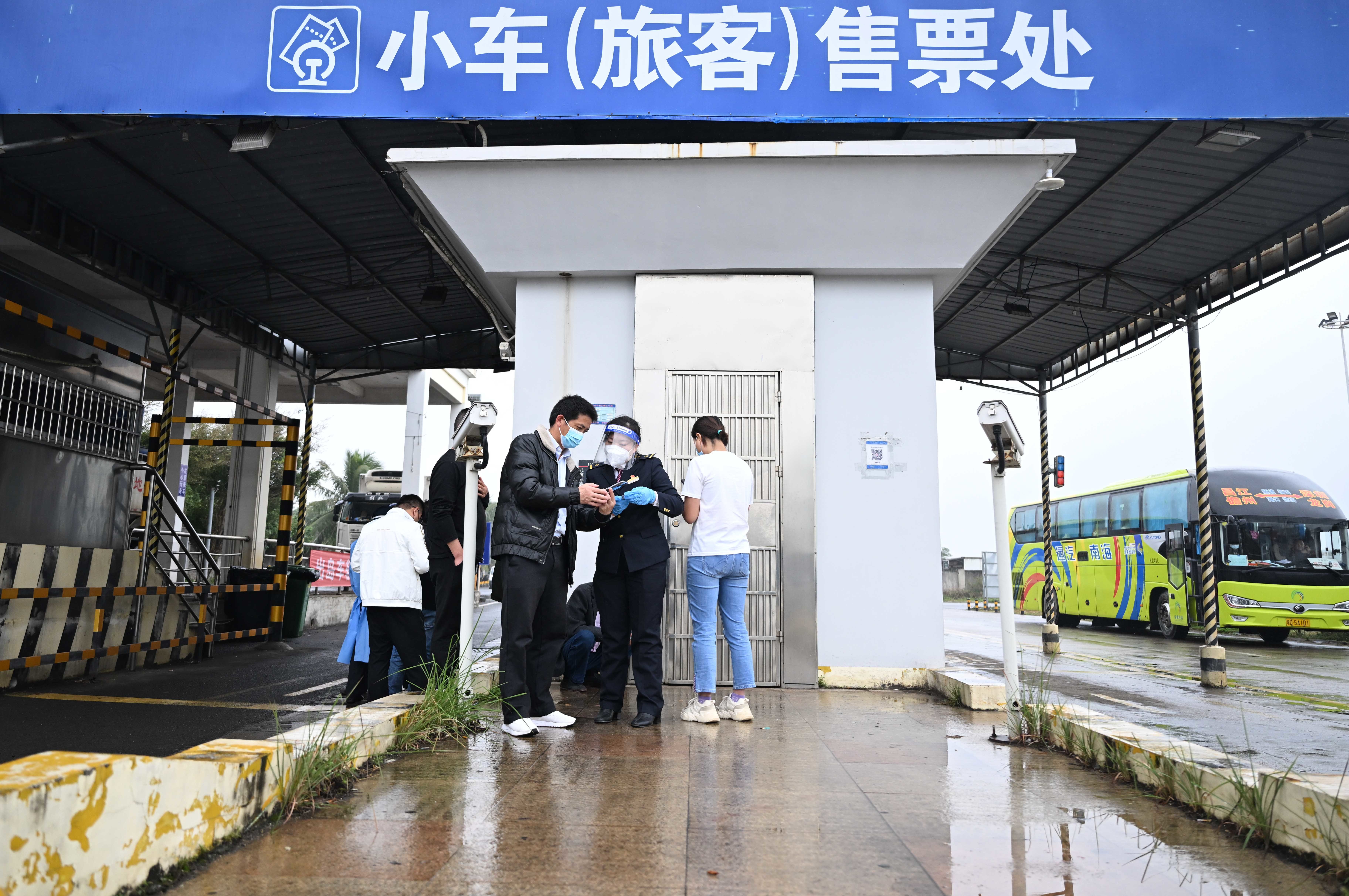 在海口的粤海铁路轮渡南港码头售票处,伍琳(右二)帮助旅客在小程序上购买船票(1月9日摄)。新华社记者 邓华 摄