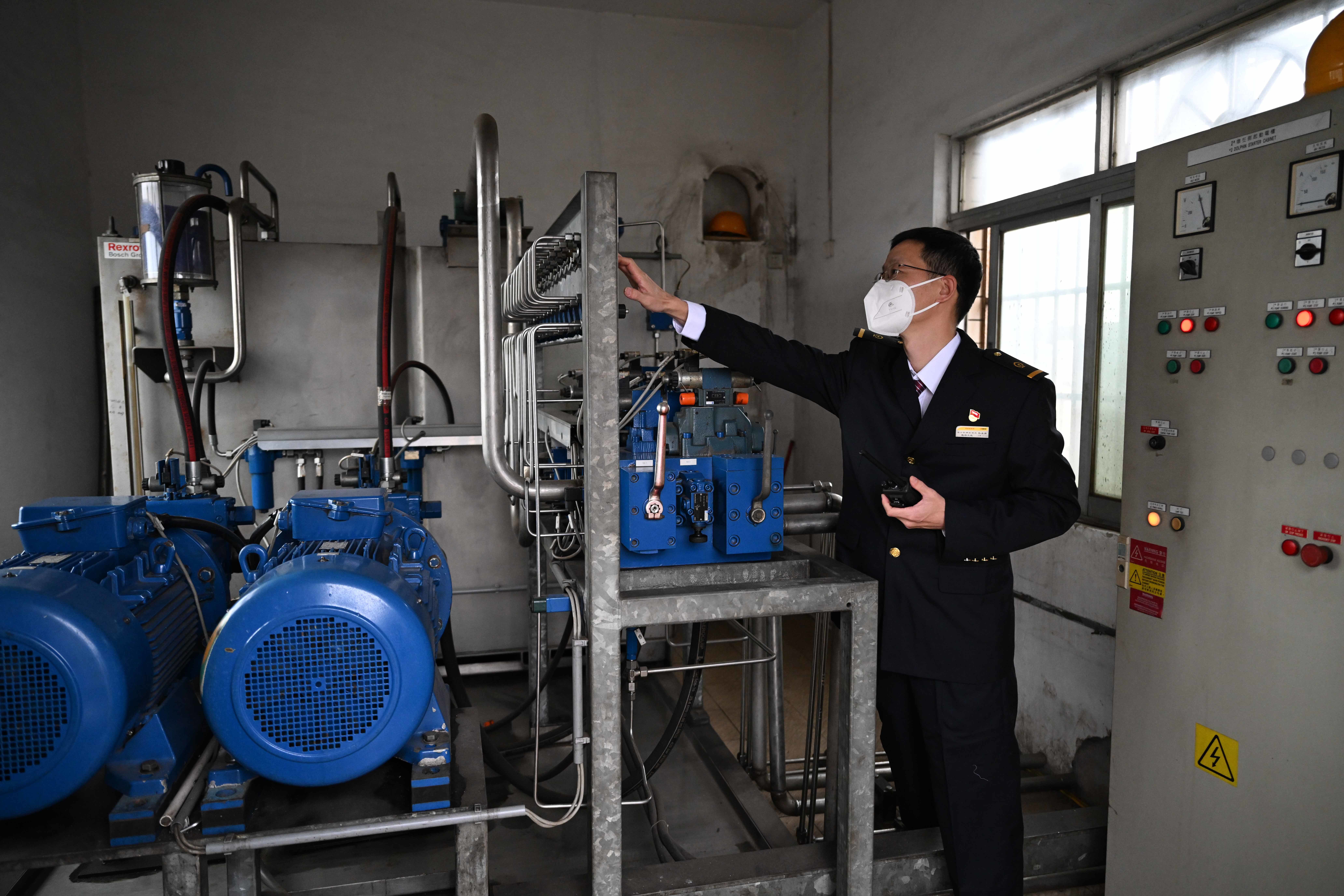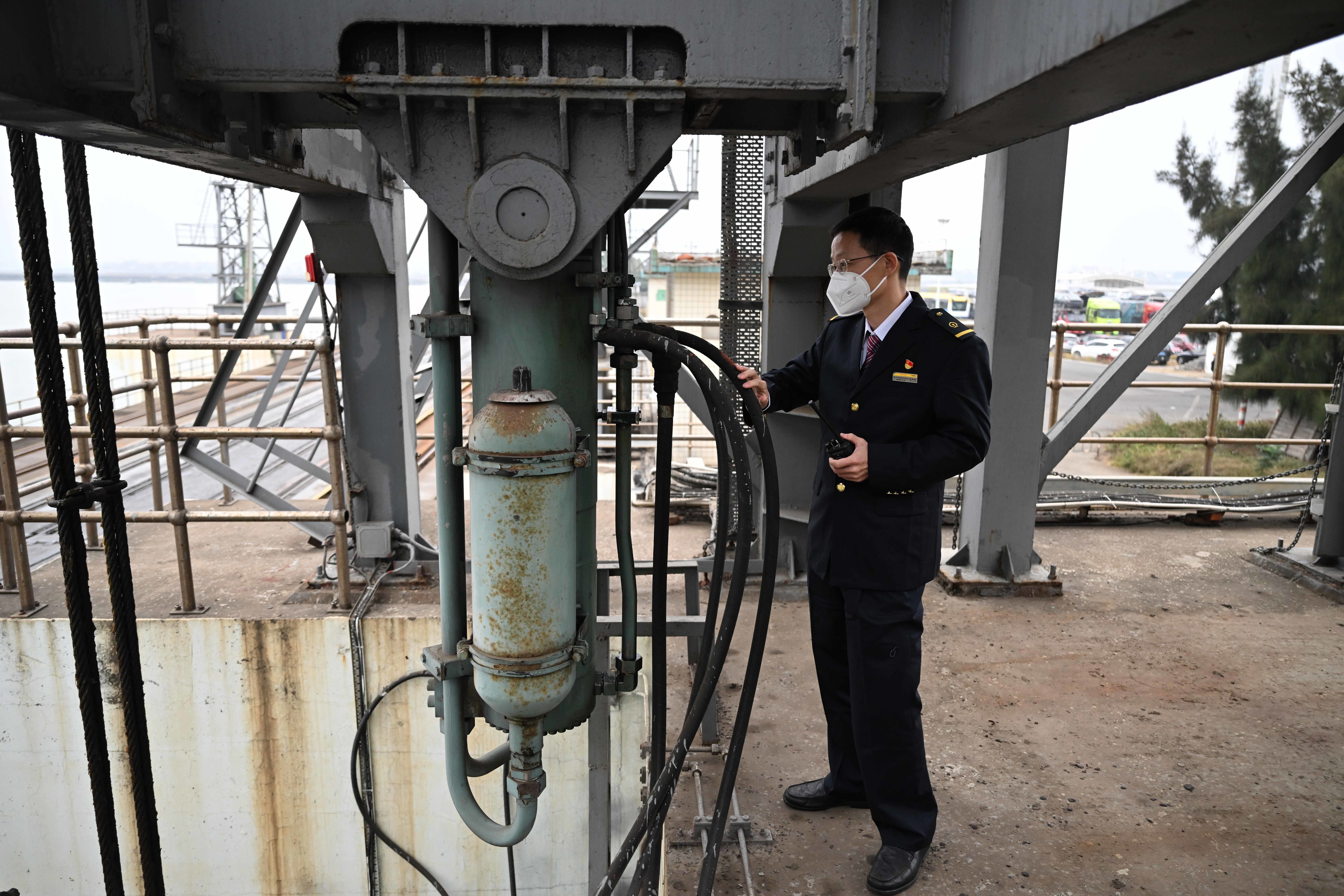 在广东徐闻的粤海铁路轮渡北港码头,熊美周巡检液压设备(1月8日摄)。新华社记者 邓华 摄