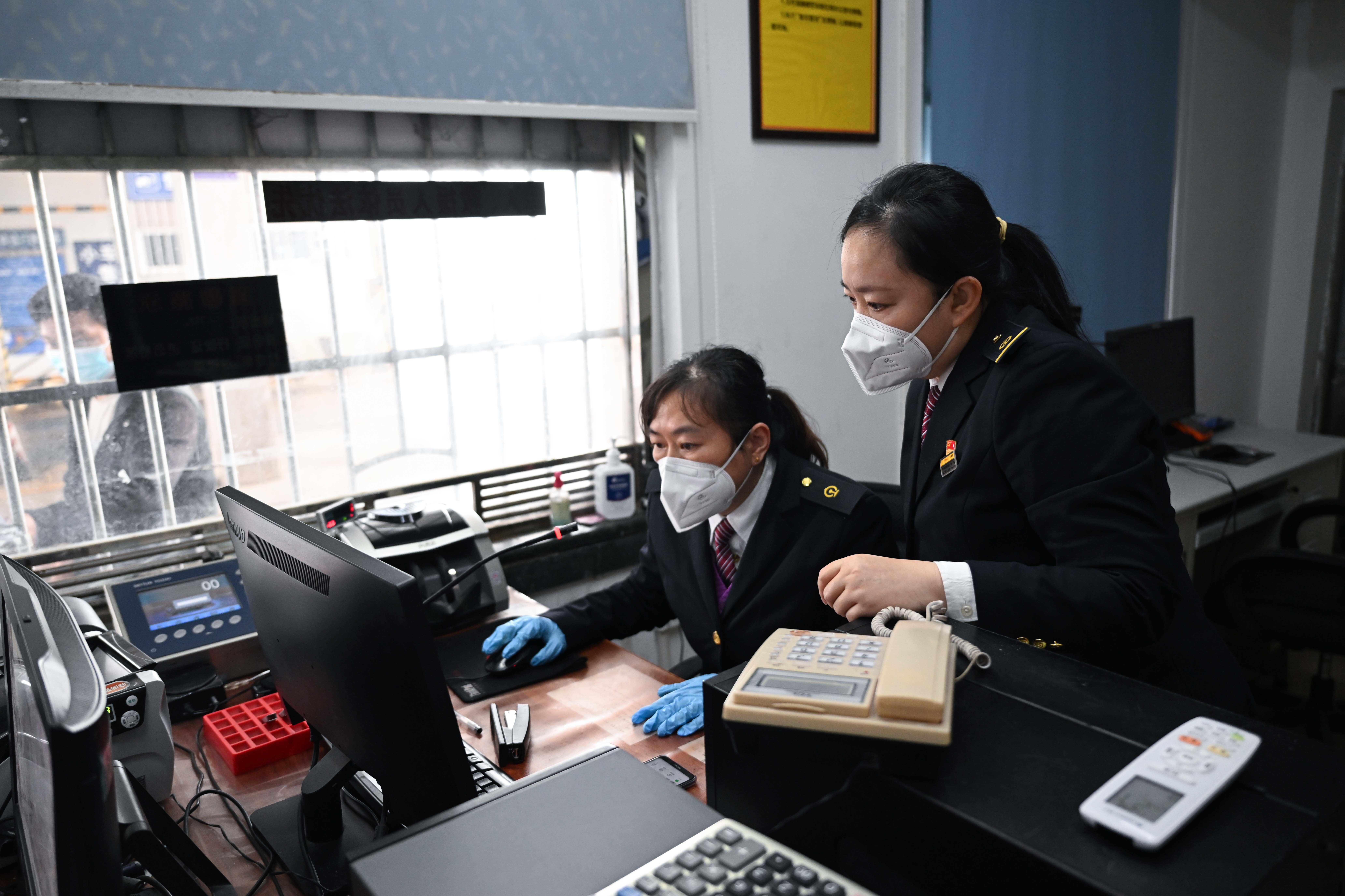 在海口的粤海铁路轮渡南港码头售票处,伍琳(右)和同事交接业务(1月9日摄)。新华社记者 邓华 摄