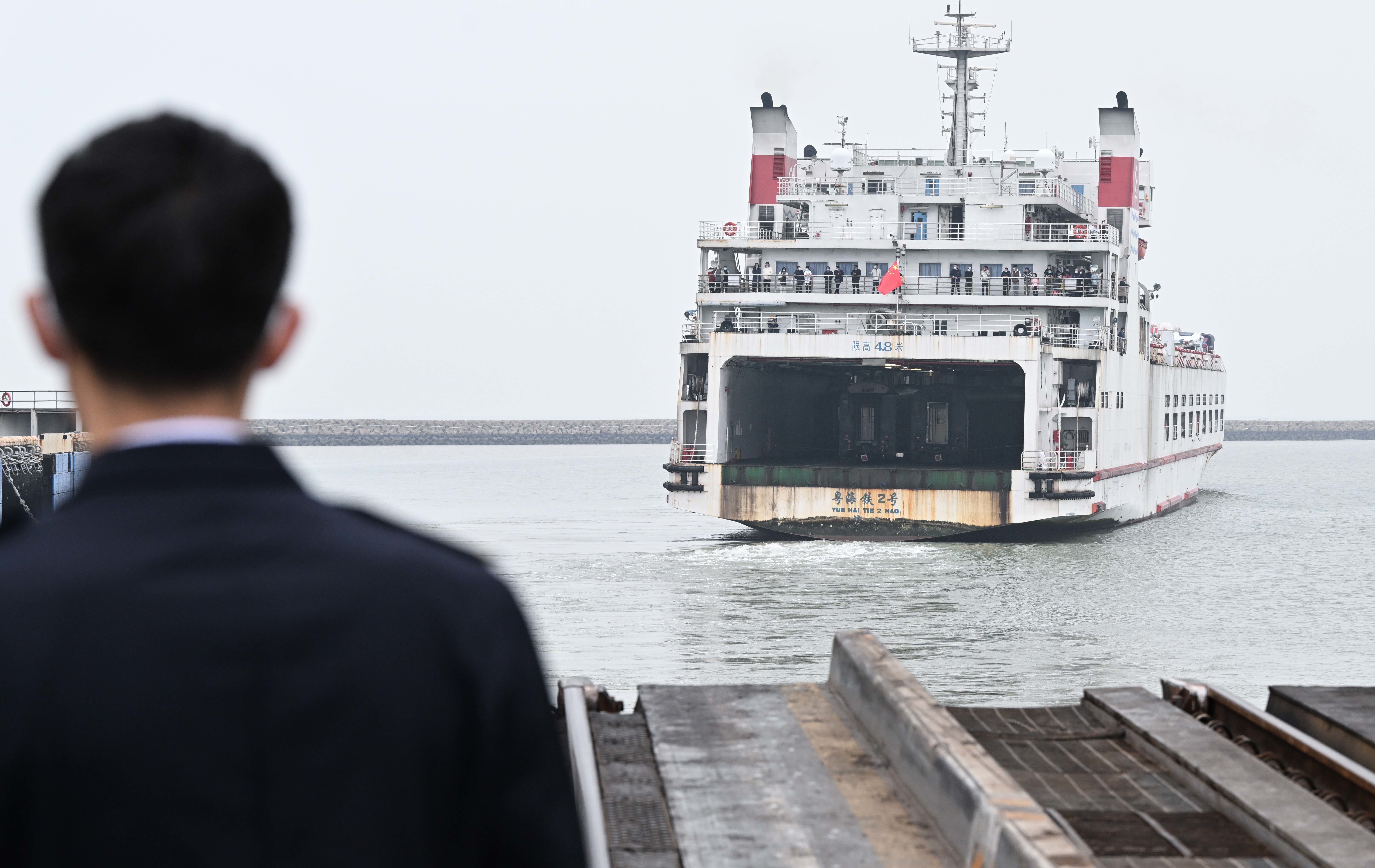 在广东徐闻的粤海铁路轮渡北港码头的火车栈桥上,熊美周目送离港的轮渡(1月8日摄)。新华社记者 邓华 摄