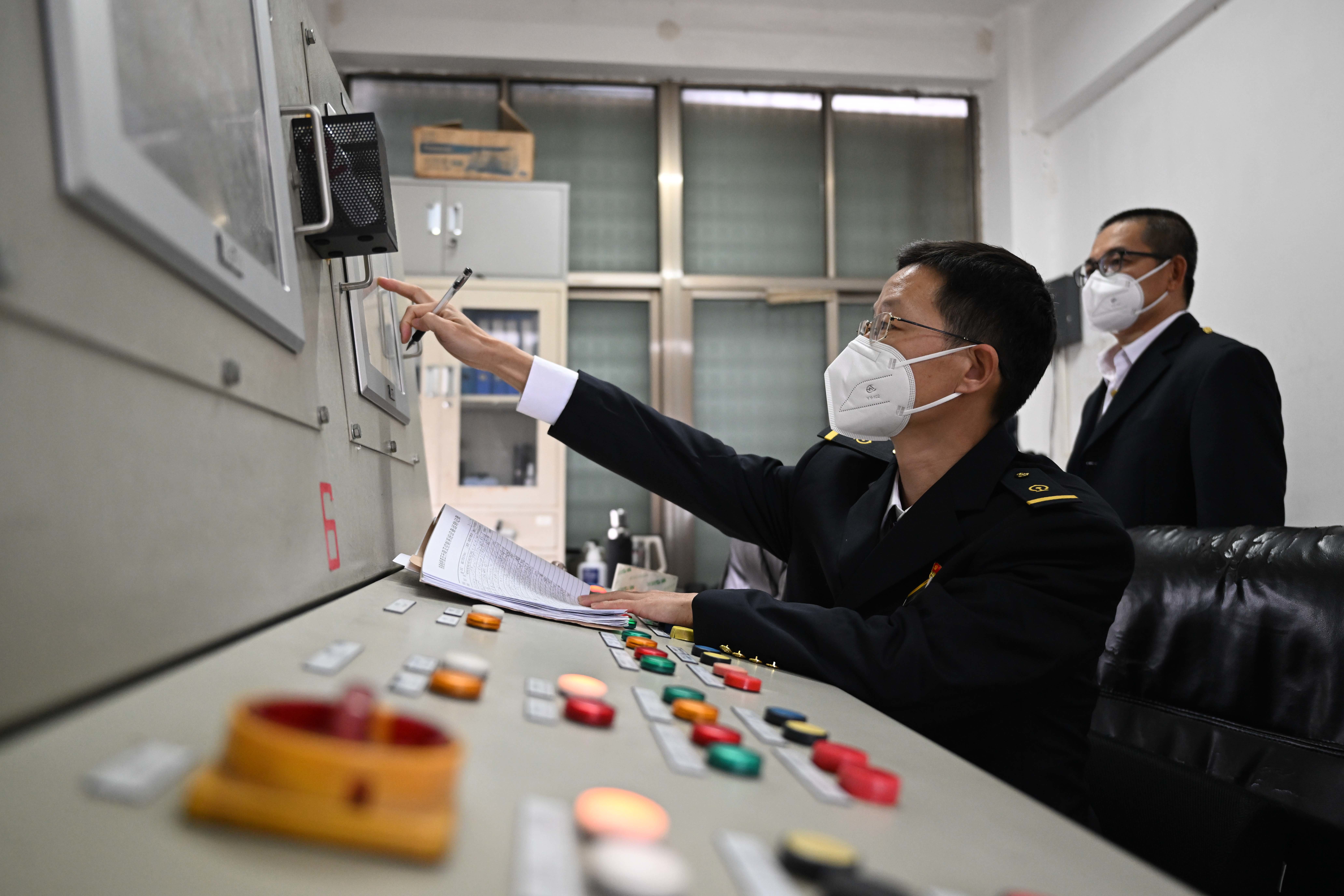 在广东徐闻的粤海铁路轮渡北港码头,熊美周在动力间检查设备运行情况(1月8日摄)。新华社记者 邓华 摄