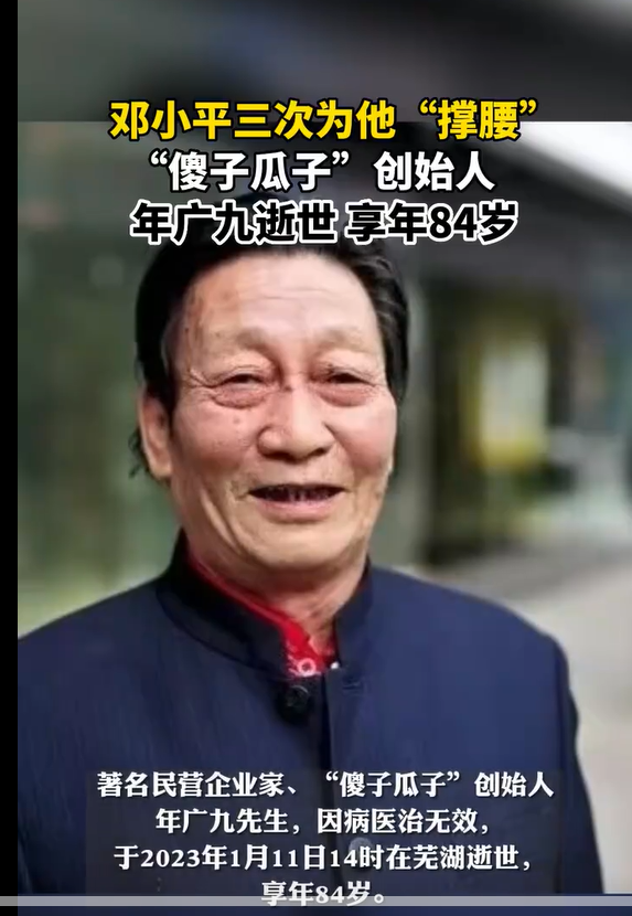 1月12日,大皖新闻记者从年广九亲属处获悉,我国著名民营企业家、“傻子瓜子”创始人年广九先生,因病医治无效,于1月11日14时在安徽芜湖逝世,享年84岁。