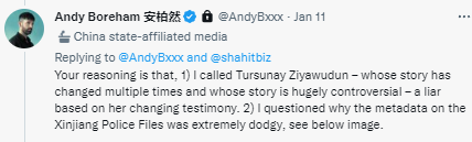 就在上述这条推文发布1小时左右,安柏然发文回复称,“你们(指控我)的理由是,1) 我认为吐尔逊娜依·孜亚吾顿(曾声称自己‘在新疆被拘留’——编者注)的故事已经变了很多次,她的故事非常有争议——(她)是一个骗子,因为她的证词不断在变化。2) 我质疑(你们的)‘新疆警方档案’的元数据非常可疑”。安柏然表示,“新疆受害者数据库”是在诽谤,且拒绝将他的名字从数据库中删除,他正和律师商量此事。↓