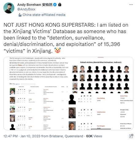 在这一帖子中,该组织宣称将“2000多名乌鲁木齐警察添加到问责数据库”,因为“他们和1000多名有记录的受害者有关系”。然而这份名单却闹了个大笑话,推文配图中赫然显示中国香港演员刘德华、周润发的照片。据观察者网报道,此举遭无数网民群嘲:“如今编造一个反华故事都如此不走心了吗?”“刘德华和周润发不在演艺圈发展,去新疆做警察了?”