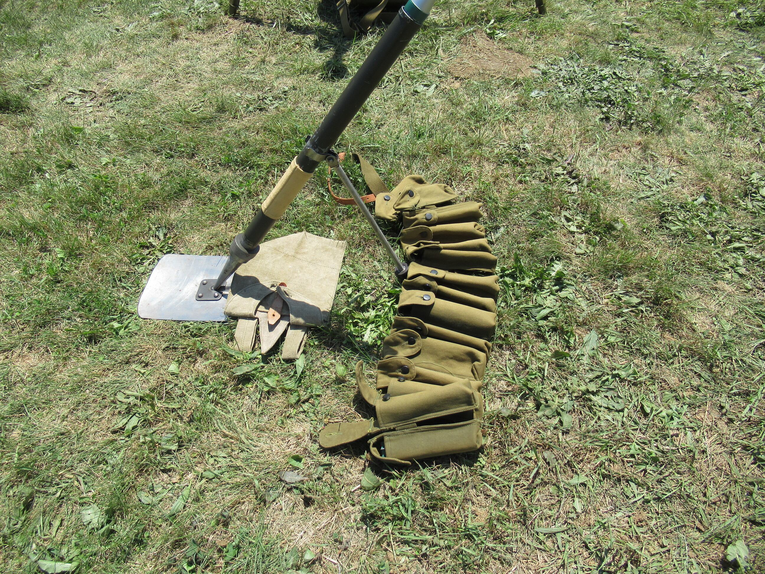 之前说了,这款迫击炮是单兵操作的,尺寸重量都正合适,再加上一条容纳15发炮弹的弹带,一个苏联大兵可以很轻松的携带,还能带一把枪。
