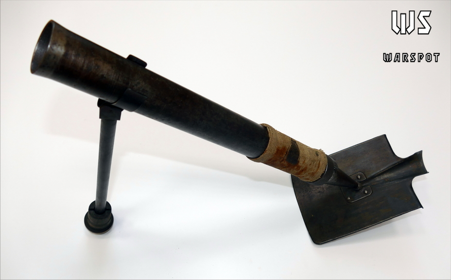 VM37迫击炮全长65公分,铲子大概是19*15cm的尺寸,炮管和铲子靠一个旋转锁环连接,内部有一个固定击针,外面有一根支架,架炮的时候靠那根支架底部戳在地上固定。这东西总重1.5公斤,使用37mm炮弹,射程是60到250米之间。