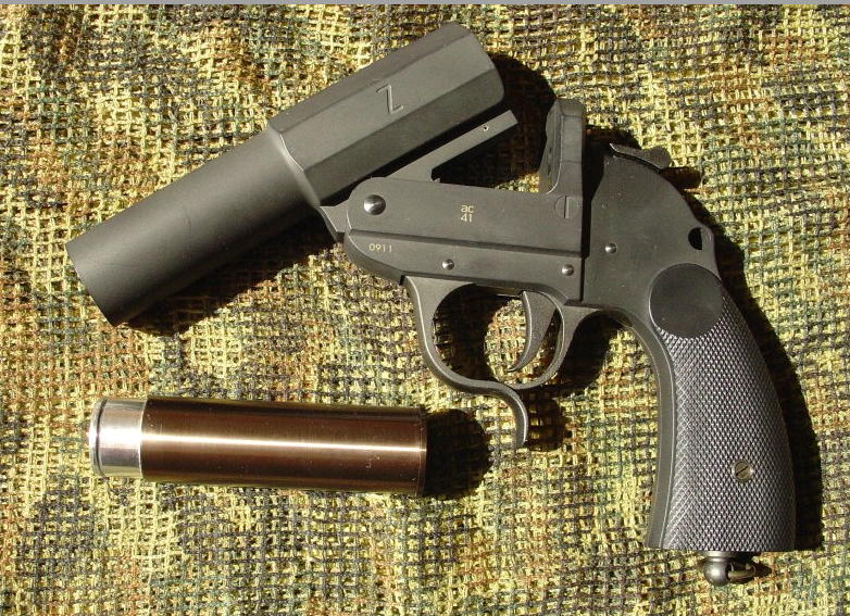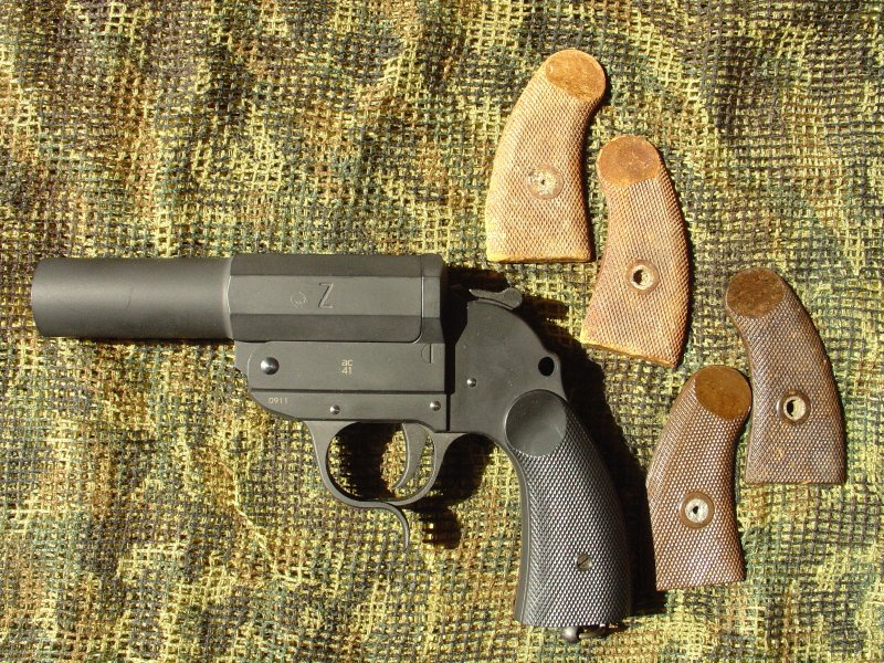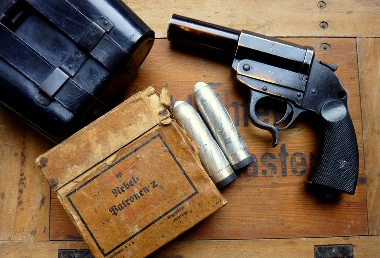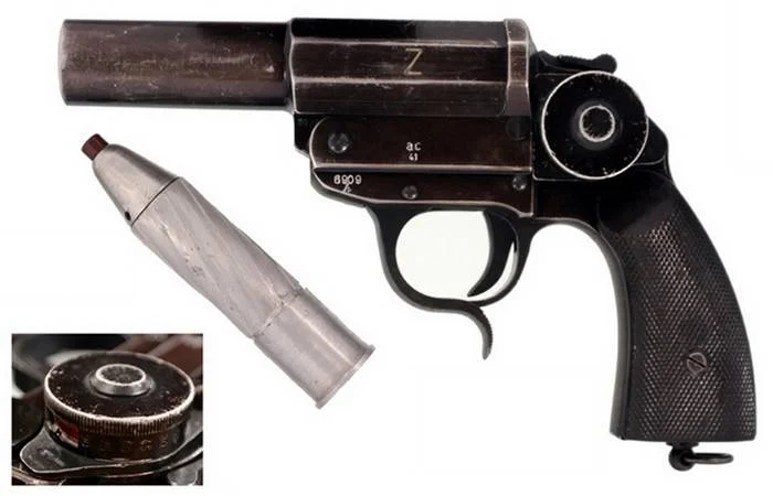 这把战斗手枪的研发基础是Leuchtpistole信号枪,一把没有膛线的单发滑膛枪,是德军三十年代开始列装的。这东西主要用途是打信号弹,但是也可以打标记弹、照明弹、烟雾弹,反正都是通用的。
