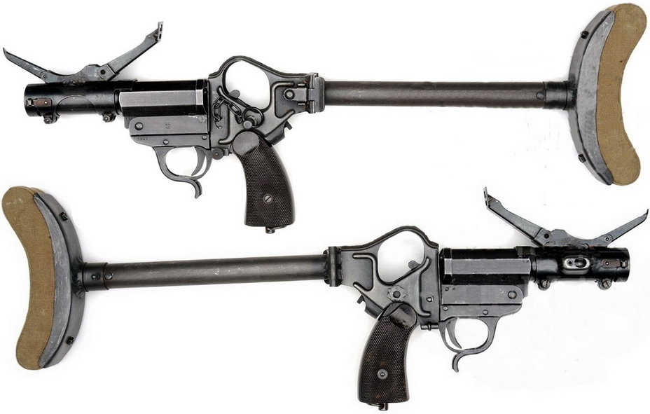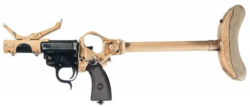 外形上这把突击手枪和那把信号枪看上去还是差不多,但是为了增加其战斗力,德国人专门为这把枪开发了枪托和瞄具,可以作为套件加装在枪上面,并且枪托套件在装在枪上之后,还可以进行折叠,便于携带。