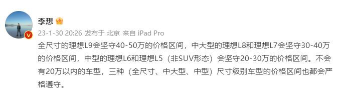 昨日,理想汽车创始人李想在微博上发帖统计了理想汽车所有车型覆盖的价格区间,据李想表示“理想汽车不会有20万以内的车型,三种(全尺寸、中大型、中型)尺寸级别车型的价格区间也都会严格遵守。全尺寸的理想L9会坚守40-50万的价格区间,中大型的理想L8和理想L7会坚守30-40万的价格区间,而中型的理想L6和理想L5(非SUV形态)会坚守20-30万的价格区间。”