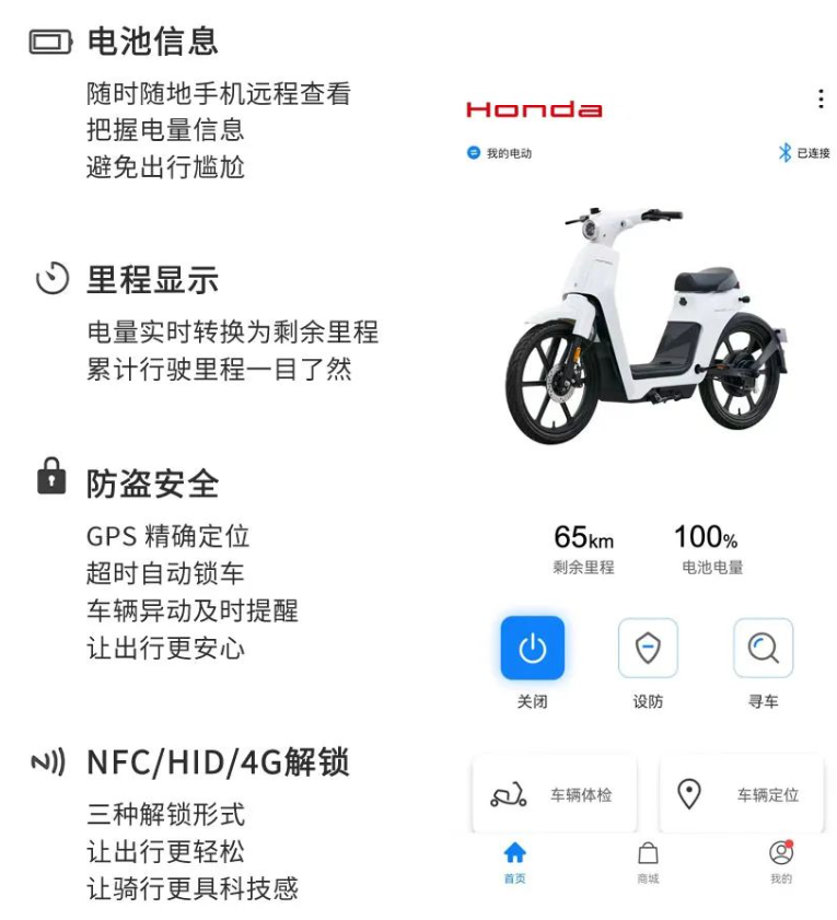 此外,该车支持手机远程连接,查看电量、里程、GPS 定位、异动提醒,还支持 NFC / HID / 4G 解锁。