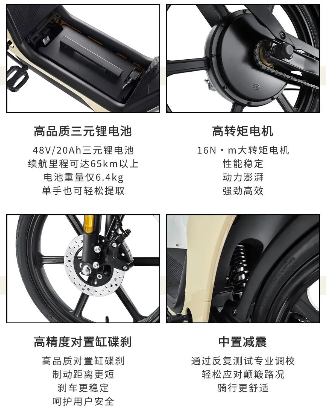 性能方面,该车搭载 48V / 20Ah 三元锂电池,续航达 65 km,电池重量仅 6.4kg,配备 16N・m 转矩电机,采用对置缸碟刹,以及中置减震。