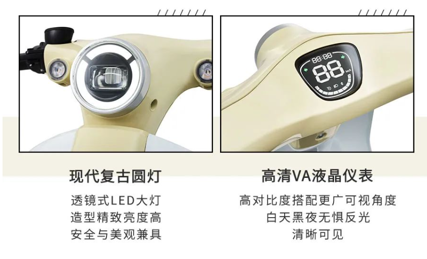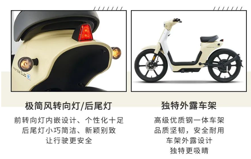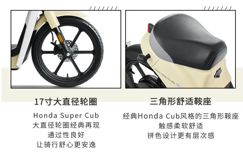 设计方面,本田 Honda Cub e: 继承了 Honda Super Cub 的外观设计,采用现代复古圆灯、高清 VA 液晶仪表盘、极简风转向灯 / 后尾灯、外露钢一体车架、17 英寸大直径轮圈、三角形鞍座。