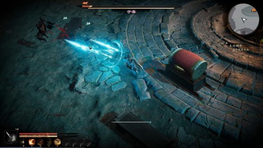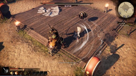 场景则是我个人相对比较满意的地方,因为游戏玩法上延续了《暗黑破坏神》式的高速ARPG战斗,不存在战斗时切换场地的问题,所以一切都在场景里即时展开,要考虑到背景烘托,美术表达和实战场地的多重功能。在淳于琼的兵营里,全3D建模的场景展现出了较高的风格统一性,没有出现“什么元素流行就来点什么”的不自信,如果正式版流程够长,场景够丰富的话,是能够带给玩家足够沉浸感的。