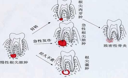 急性牙髓炎拖着不治,炎症就会继续向下发展,引起牙根尖周围组织发炎。牙根尖炎症急性发作时也会导致剧烈疼痛。