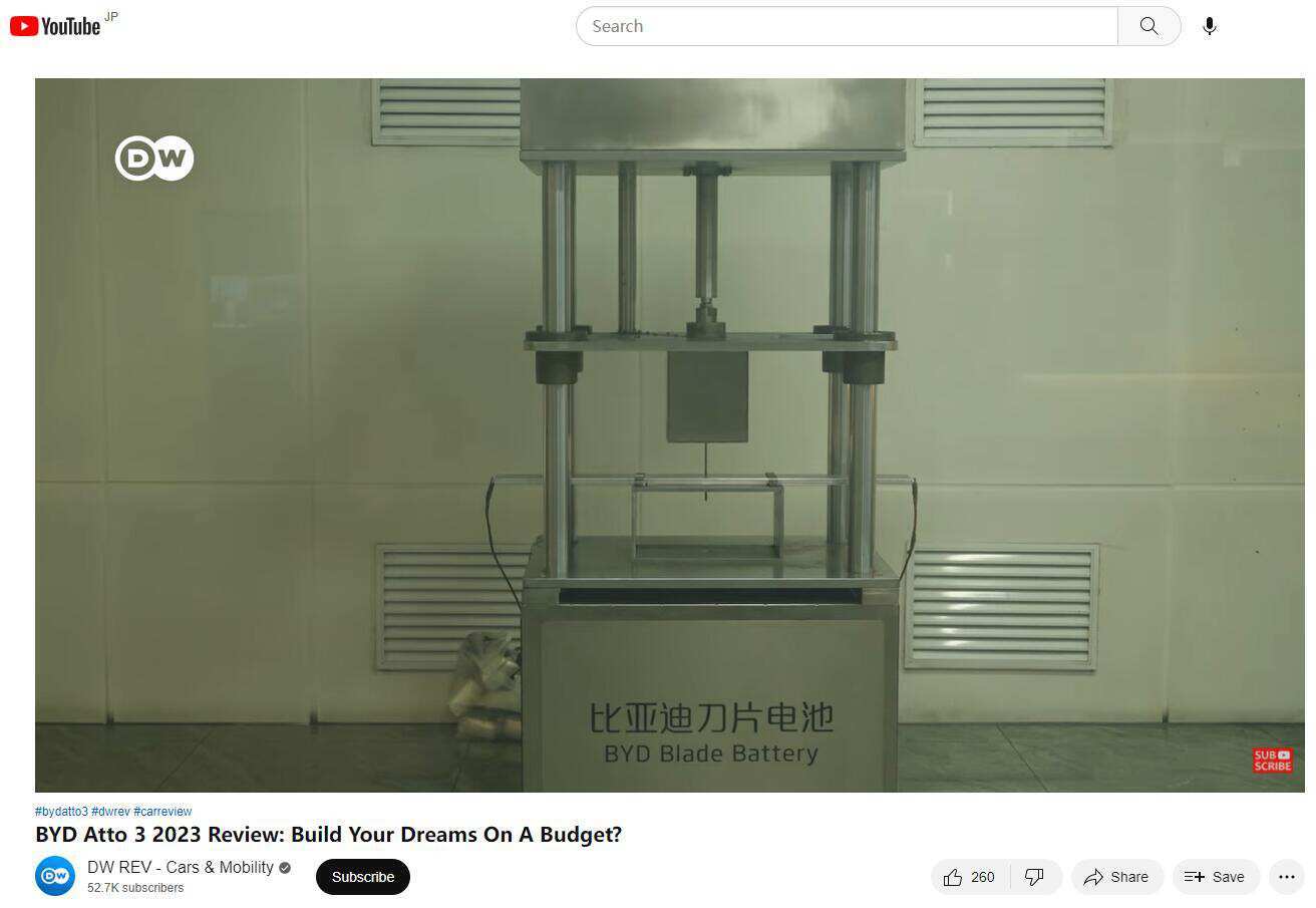在德国当地主流电视台DW对比亚迪Atto3(元Plus)的接近10分钟全方位试驾测试中,播放了一段在实验室中对刀片电池的安全性测试。测试过程简单粗暴,直接通过针刺的方式对比三元电池和比亚迪刀片电池的安全性。