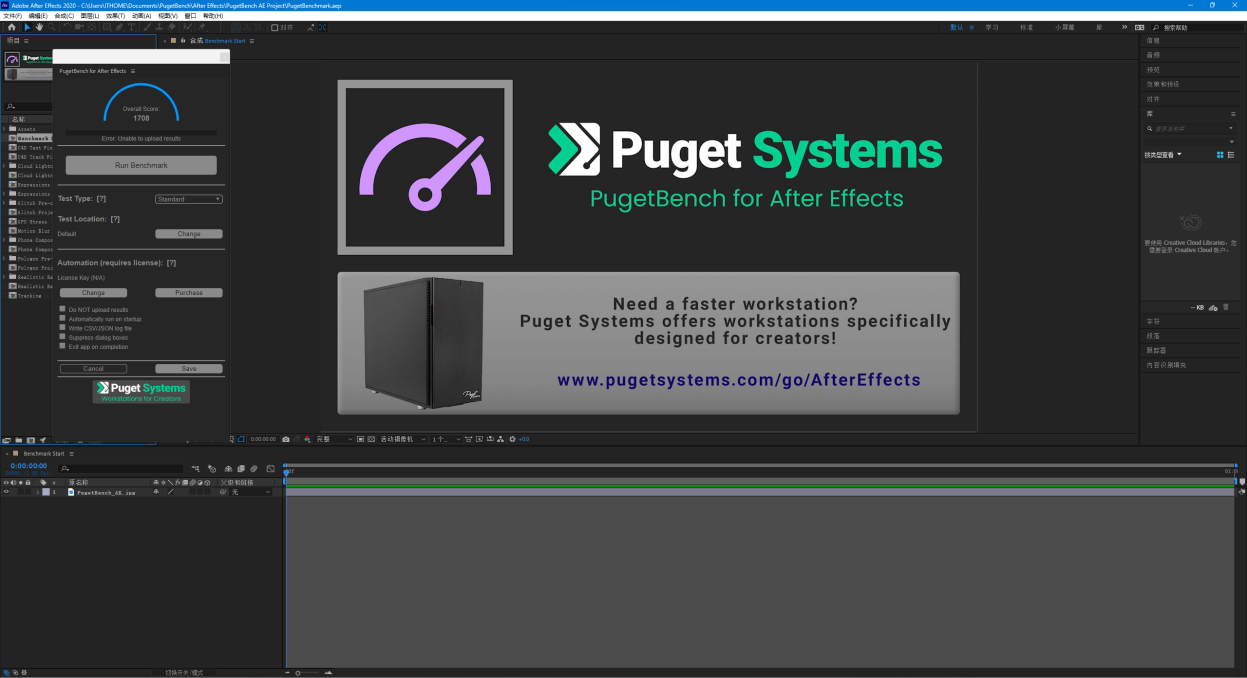 在创意工作者们常用的特效制作软件 AE 中,我们开启 GPU Cuda 加速,然后使用 PugetBenchmark 进行测试。最终得分为 1708 分,这个创意生产表现比其它的 B760 主板还要好一些。