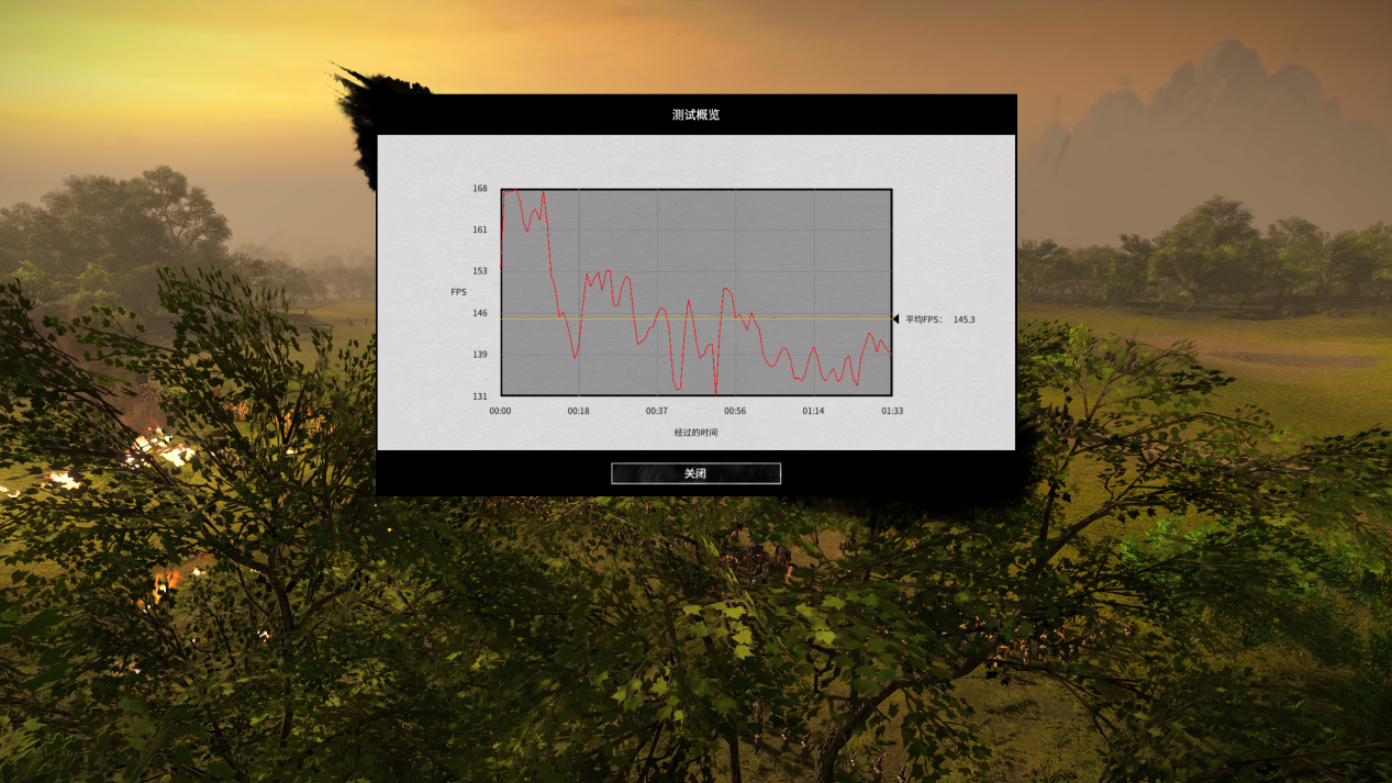 最后我们还测试了一款经典吃 CPU 的游戏《全面战争: 三国》。实测它的平均帧数达到了 145 帧,完全能流畅游玩。