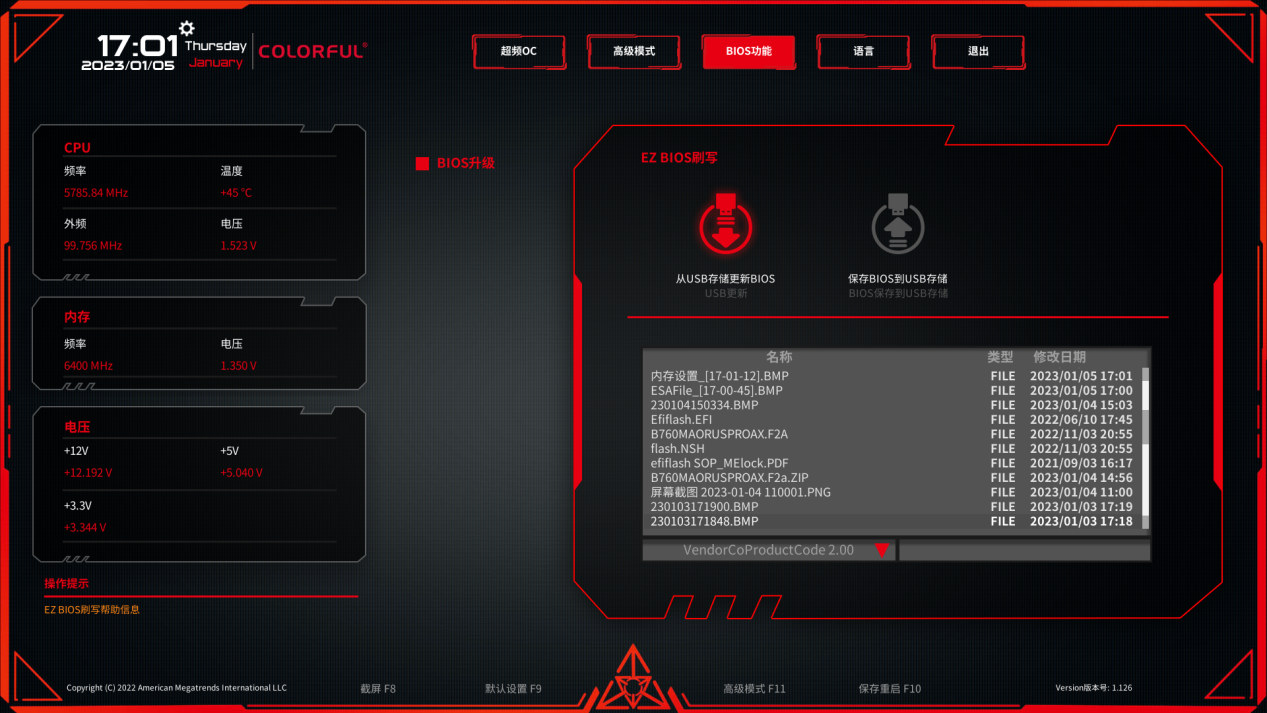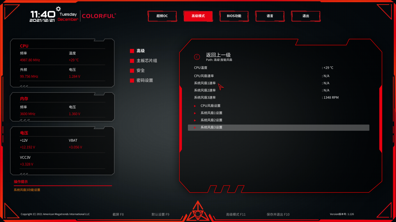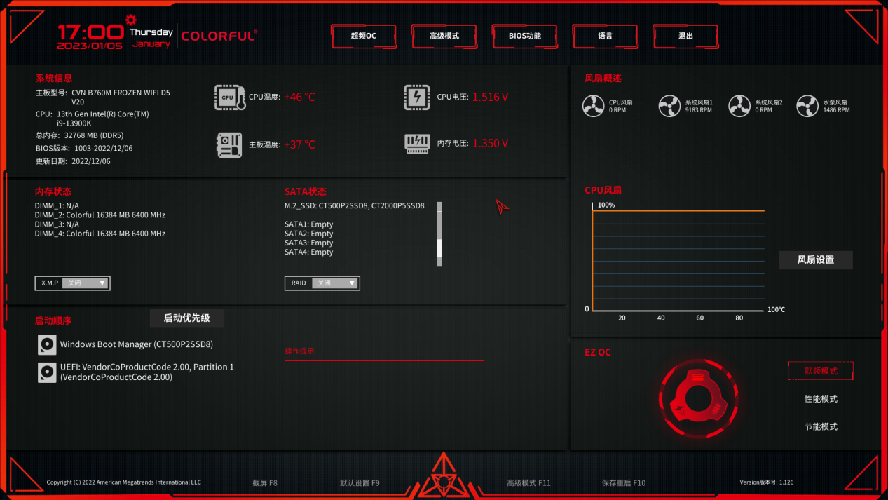 在 BIOS 易用性这一块,七彩虹一直走在板卡厂商的前面。进入 BIOS 后默认是简单模式,各种系统信息都很清晰明确,搭配大量的图标,其中可以快速通过 XMP 配置对内存频率进行调整。并且在右下角可以快速进行性能模式切换,小白也能轻松掌握。不过作为 B760 芯片组,是不支持超频的,所以选择性能模式也没啥效果。