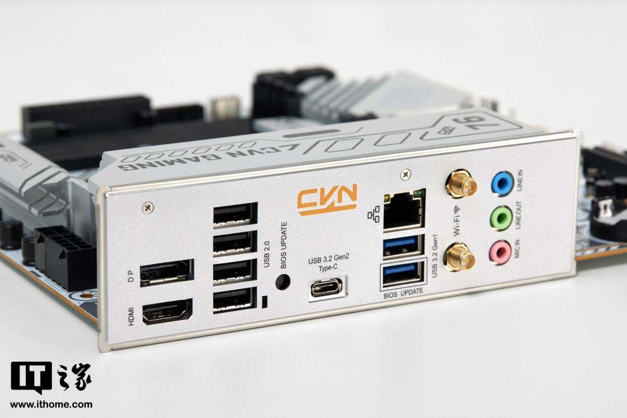 在 IO 面板区域,七彩虹 CVN B760M FROZEN WIFI D5 V20 提供 1 个 USB-C 3.2 Gen2x2 接口、6 个 USB-A 接口、DP 接口、HDMI 接口以及音频接口,可以满足绝大多数的拓展需要。网络性能也是考察主板性能重要的一环,七彩虹 CVN B760M FROZEN WIFI D5 V20 提供 1 个 2.5GHz 网口,可以满足绝大多数日常需求。除此之外,七彩虹 CVN B760M FROZEN WIFI D5 V20 还内置了无线网卡,支持 Wi-Fi 6 网络和蓝牙 5.2,有效提升数据传输体验。