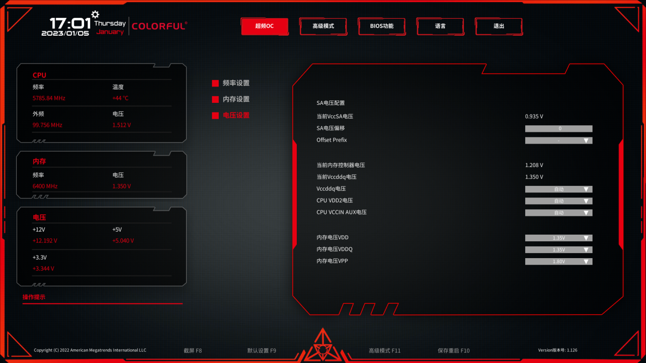 B760 主板可以对内存进行超频,按 F11 进入高级模式后,七彩虹 CVN B760M FROZEN WIFI D5 V20 就提供了很多调整选项,在电压设置里先把内存电压拉一点,就可以进一步去频率设置界面提升频率降低时序了。