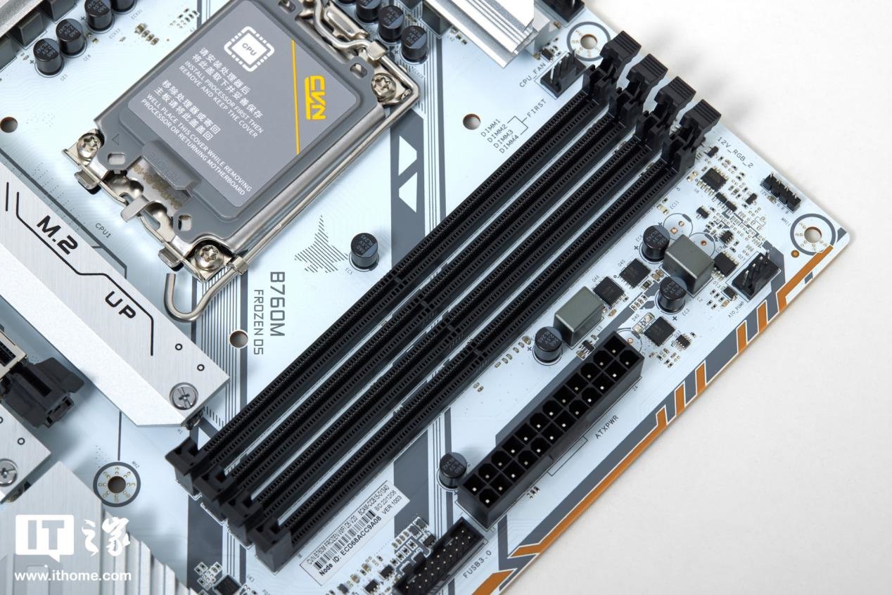 B760 系列芯片组的一大升级之处在于,进一步强化了 DDR5 内存的支持,可以上到更高的频率。因此如果你想买 B760 系列主板的话,那么笔者都推荐直接上 DDR5 版本。七彩虹 CVN B760M FROZEN WIFI D5 V20 主板提供了 4 个 DDR5 内存插槽,