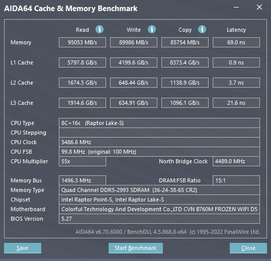开启 XMP 以后,频率来到了 6000MHz(36-24-38-65 CR2), 此时读写有了巨大提高,延迟也有所降低,这才是 DDR5 的正常速度。