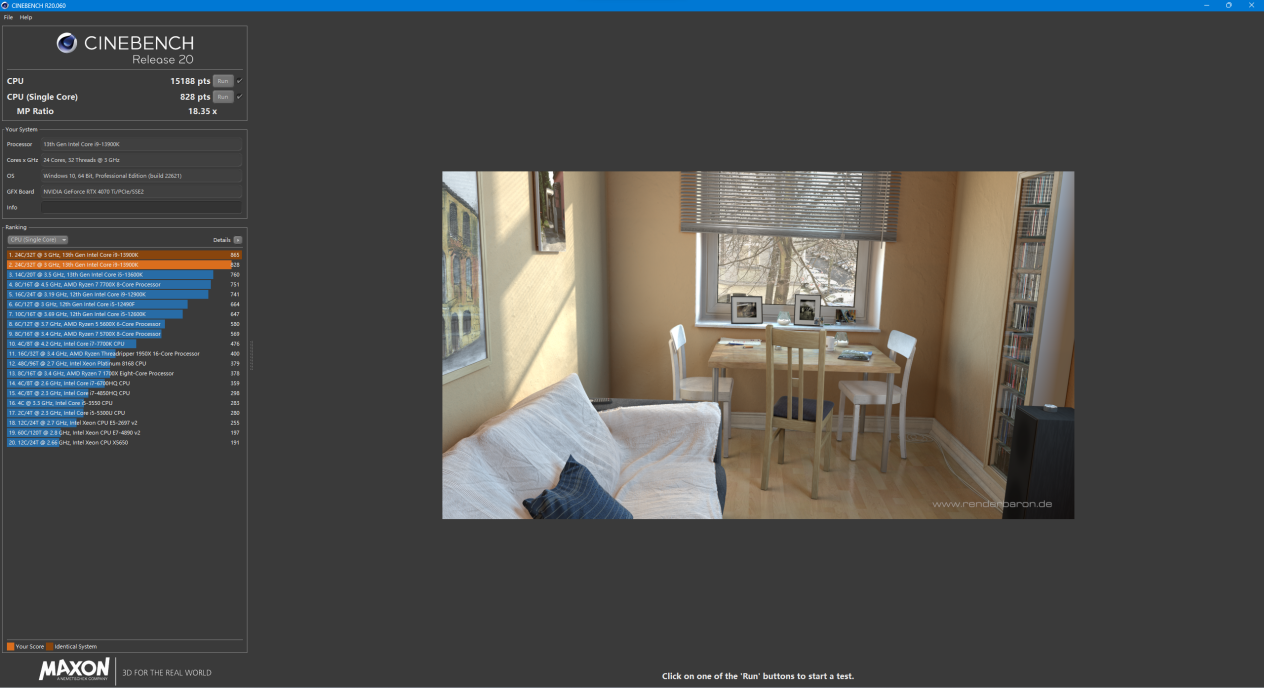 接下来,我们看看这颗处理器在七彩虹 CVN B760M FROZEN WIFI D5 V20 上的理论性能表现,首先使用 Cinebench R20,i9-13900K 的 R20 单核分数为 828 pts,多核分数为 15188 pts,作为对比,Z790 主板上单核 845 分,多核 15577 分,差距已经非常小了。