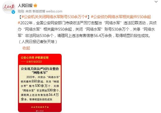 2022年,全国公安网安部门持续依法严厉打击整治“网络水军”违法犯罪活动,共侦办“网络水军”相关案件550余起,关闭“网络水军”账号530余万个,关停“网络水军”非法网站530余个,清理网上违法有害信息56.4万余条,取得明显阶段性成效。(人民日报记者张天培)
