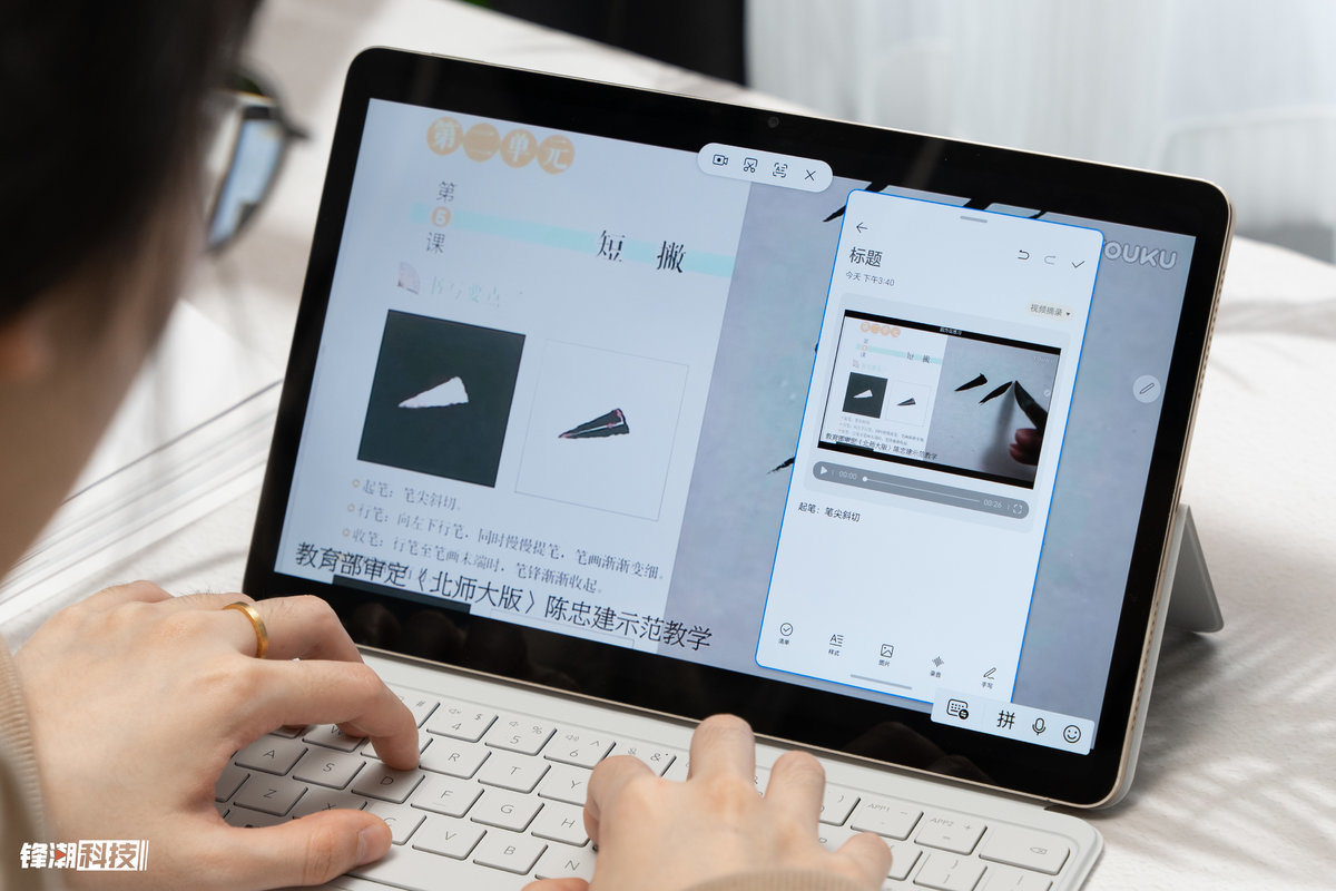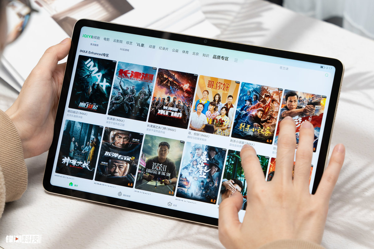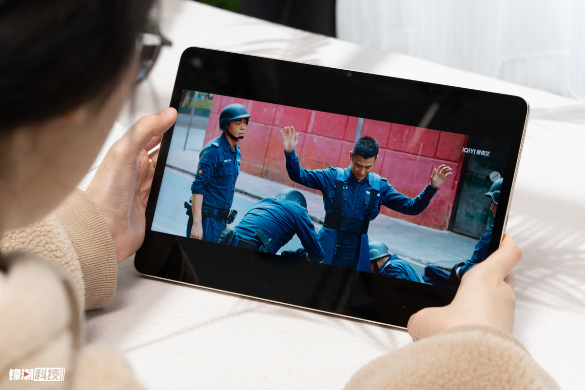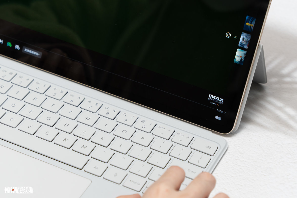 这块 12.1 英寸的大屏比例为 16:10,相比一般的平板在播放电影时黑边更小,更适合常规的流媒体平台内的视频比例,能更好地利用这块大屏幕。