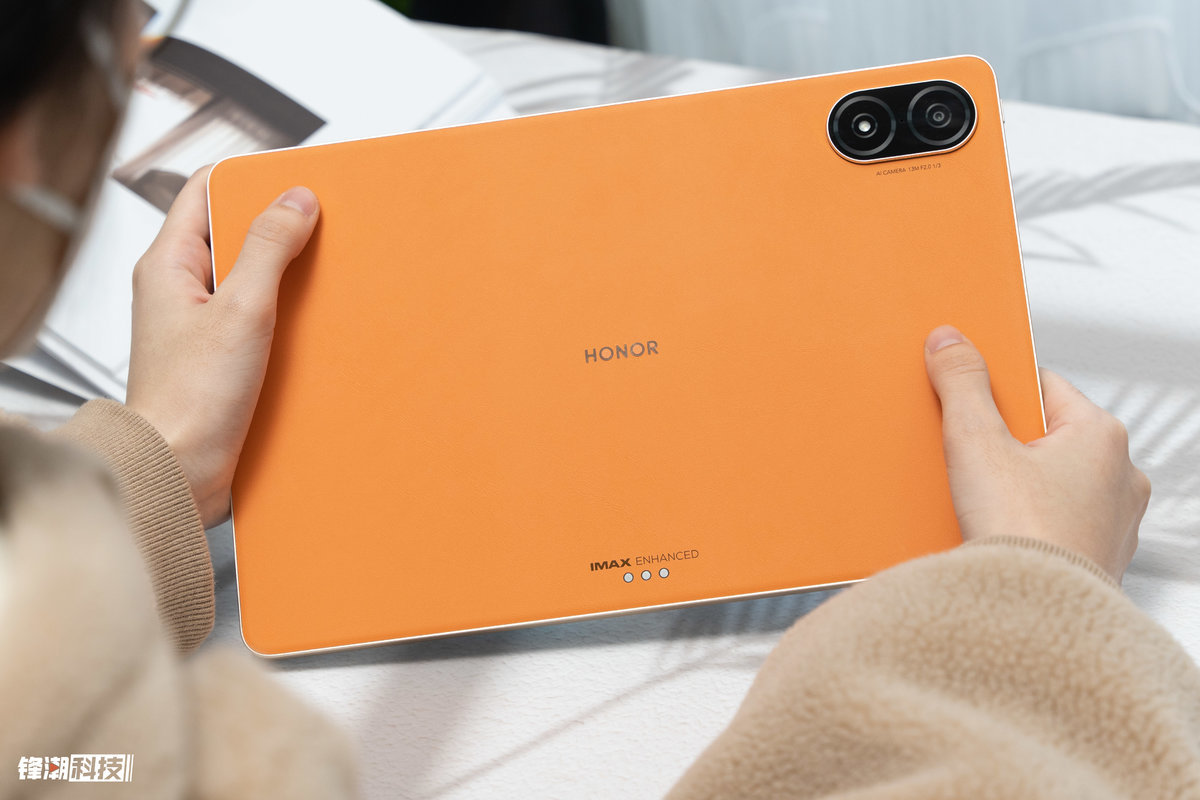 再来看看外观,荣耀平板V8 Pro 的这款配色为燃橙配色,采用了素皮材质作为平板的背盖材质,触感自然亲肤,温润舒适。加上硬朗的中框设计,握持更加顺手。这款平板的厚度仅为 6.64mm,重量仅为 589g,对于一款拥有 12.1 英寸屏幕的平板电脑来说,这个重量控制得非常不错,长时间的握持也不会有什么问题。