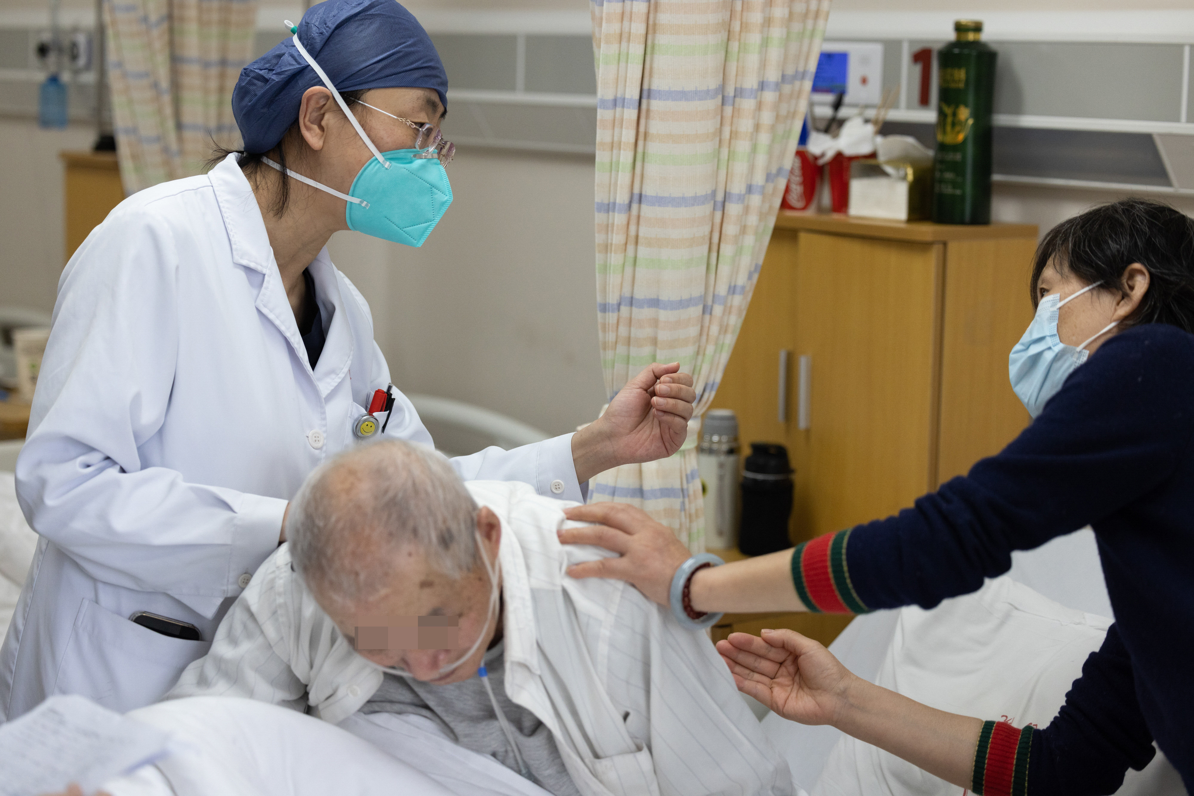 1月12日,在复旦大学附属华山医院虹桥院区,感染科主任医师李宁指导家属给患者拍背帮助排痰。新华社记者 金立旺 摄