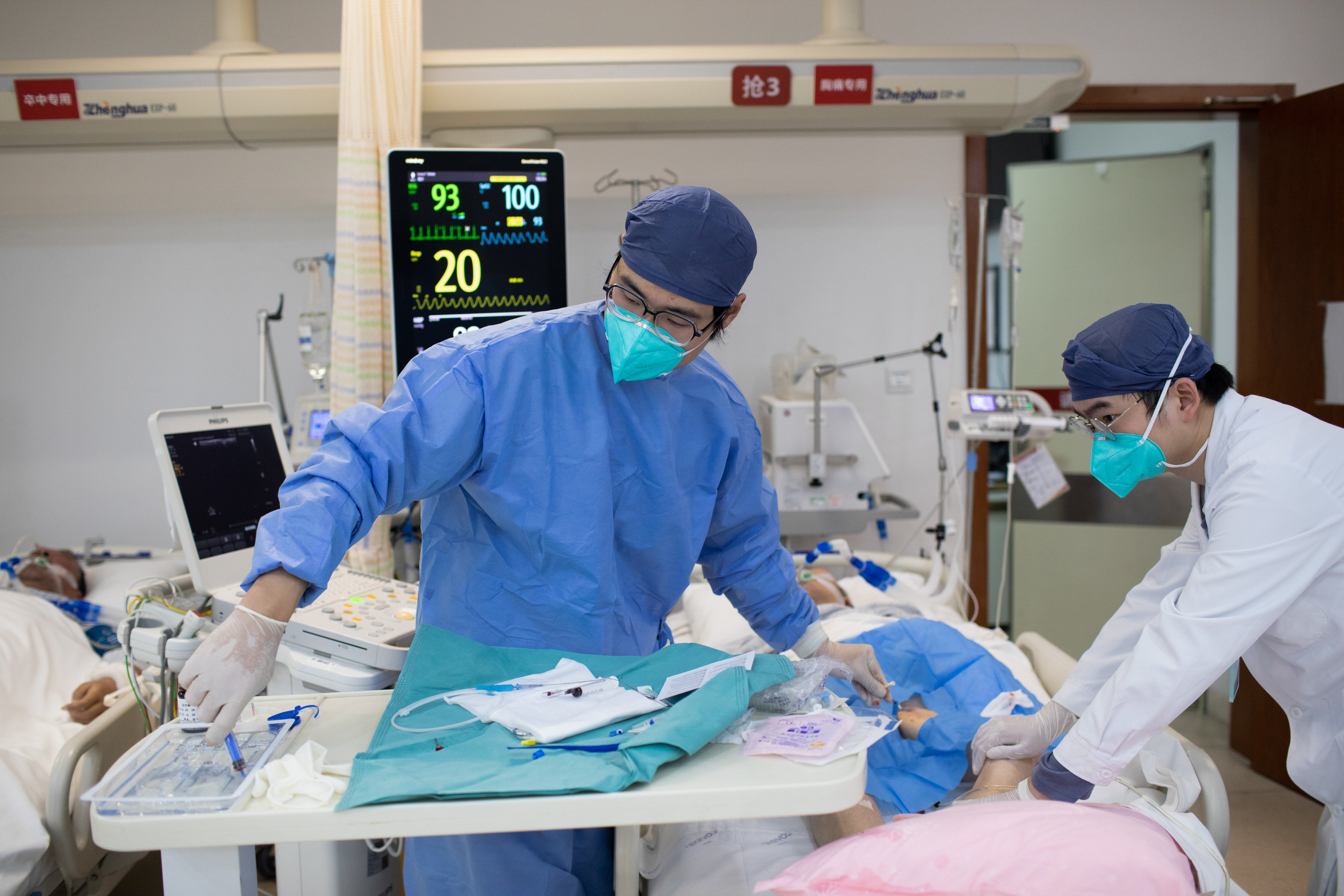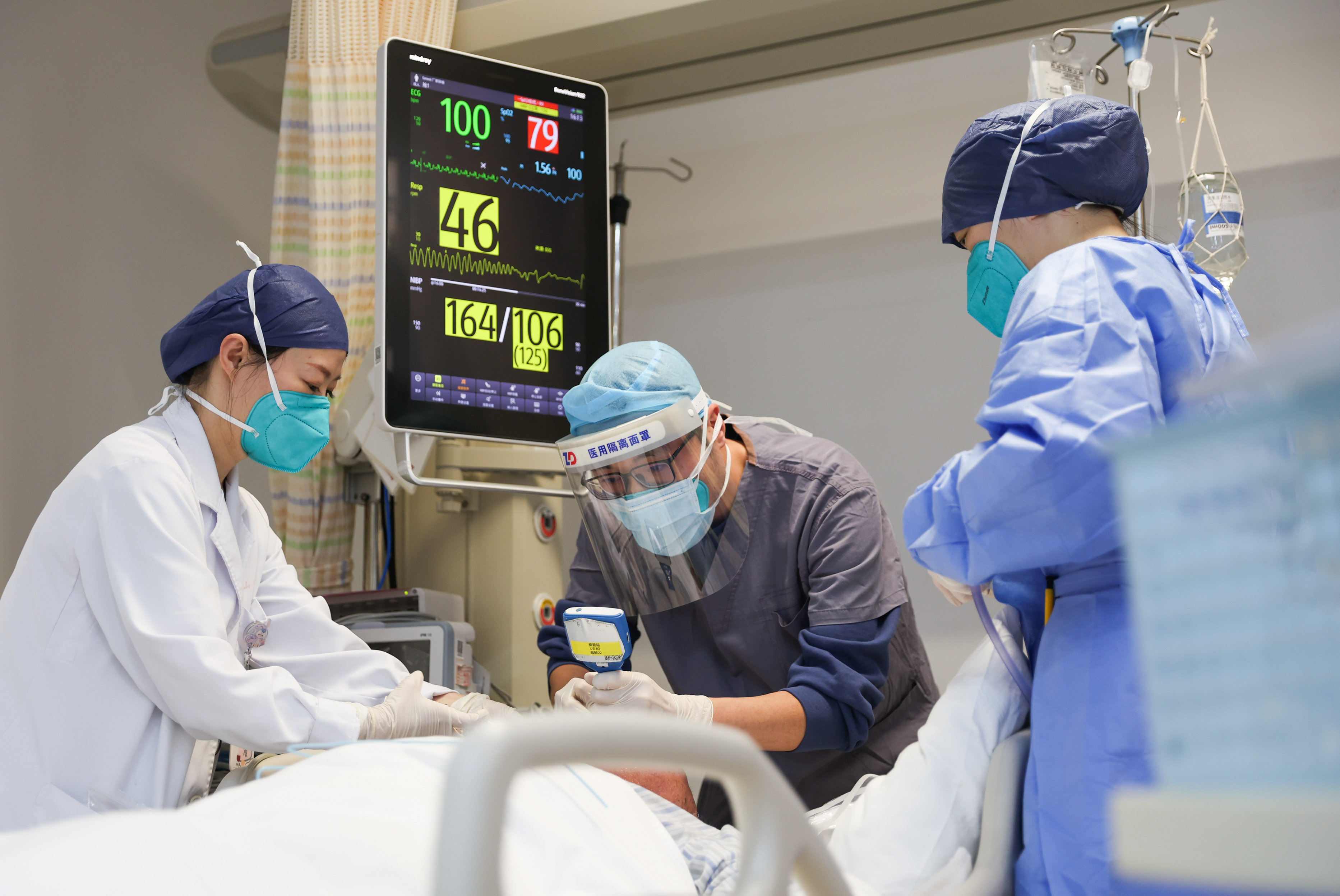 1月12日,在复旦大学附属华山医院虹桥院区急诊抢救室,医生沈家豪(左)和同事给一名患者做深静脉穿刺操作。新华社记者 金立旺 摄