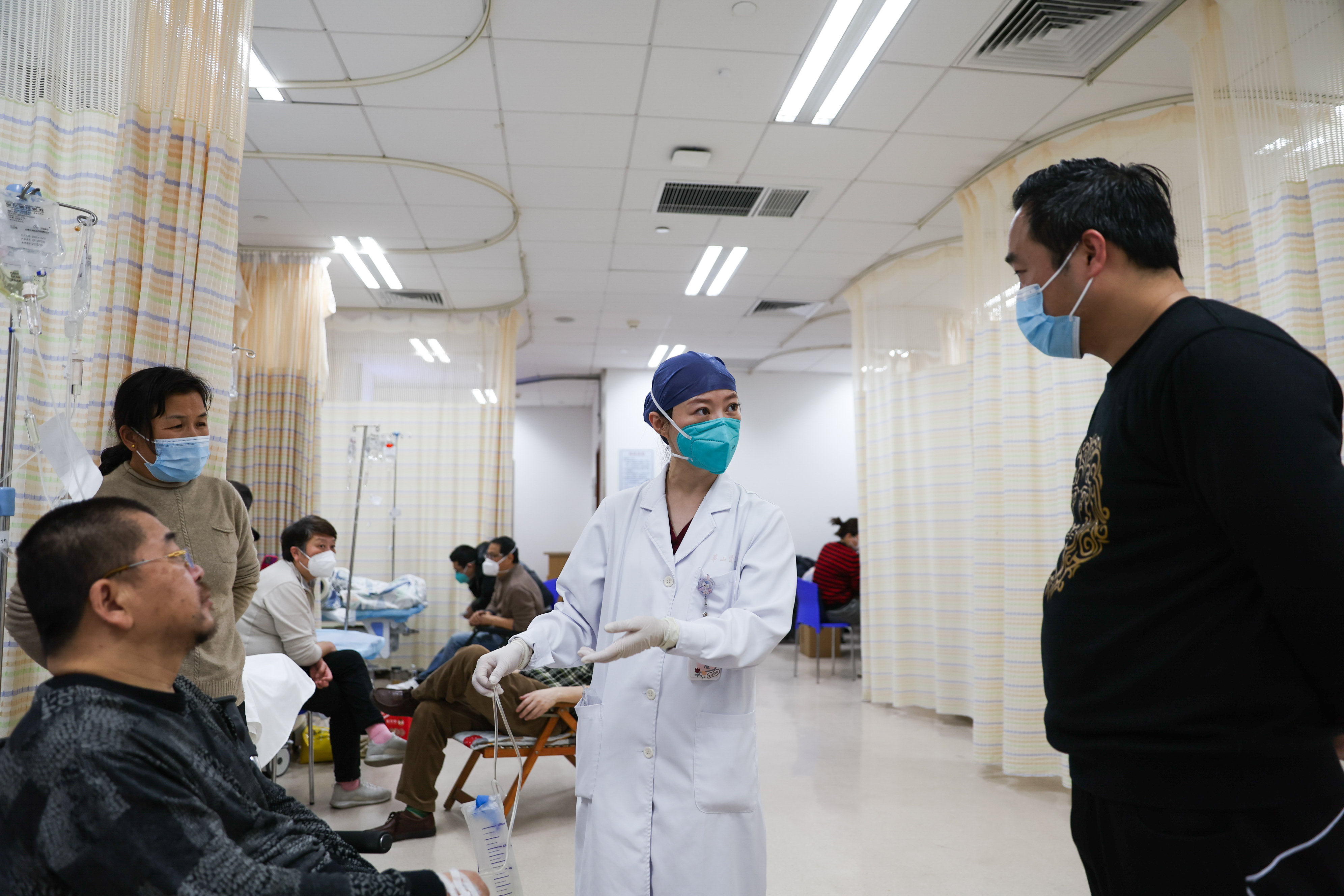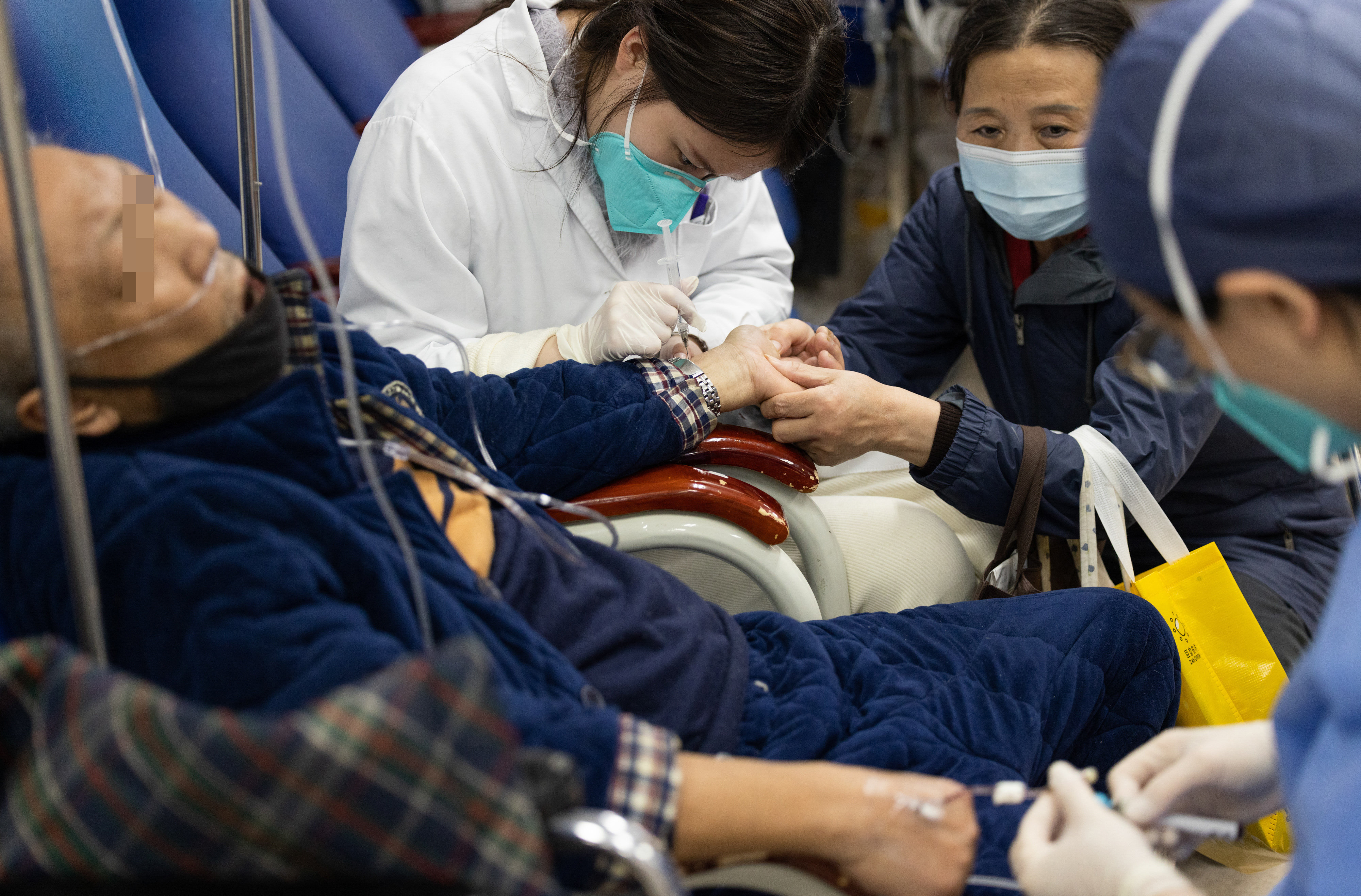 1月8日,在复旦大学附属华山医院虹桥院区急诊大厅,急诊科护理值班长富小凤给患者抽血。新华社记者 王翔 摄